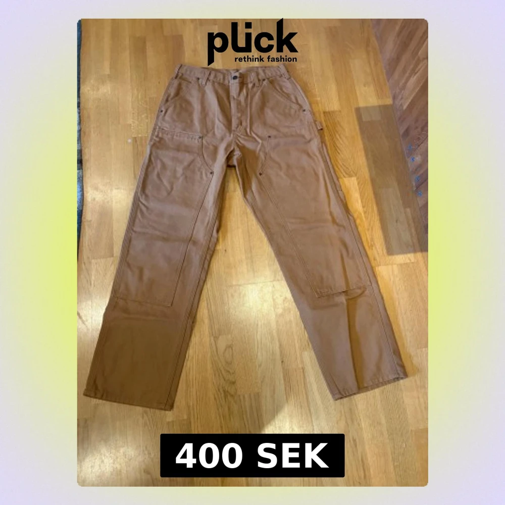 Ett par carhartt double knees i brun som är använda 1 gång. Har använts och tvättats 1 gång. Inga fel med dem. Har ganska straight baggy passform