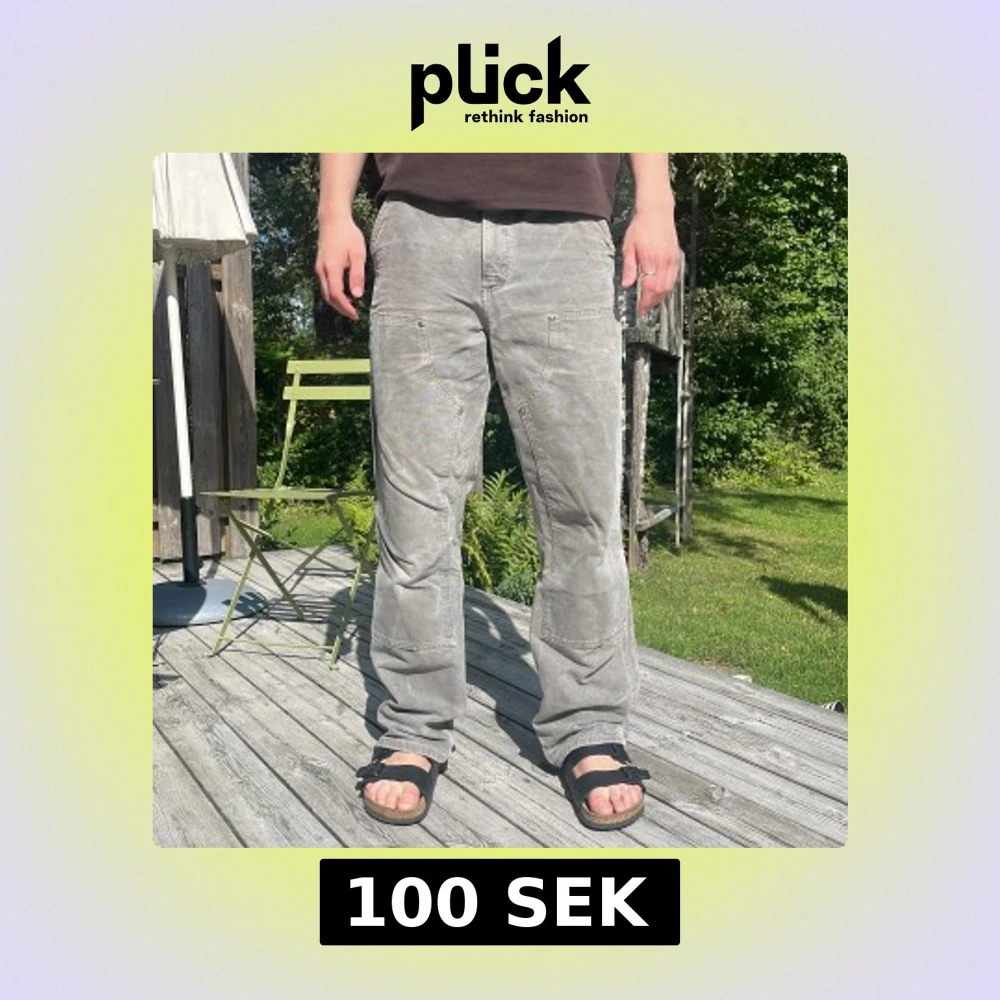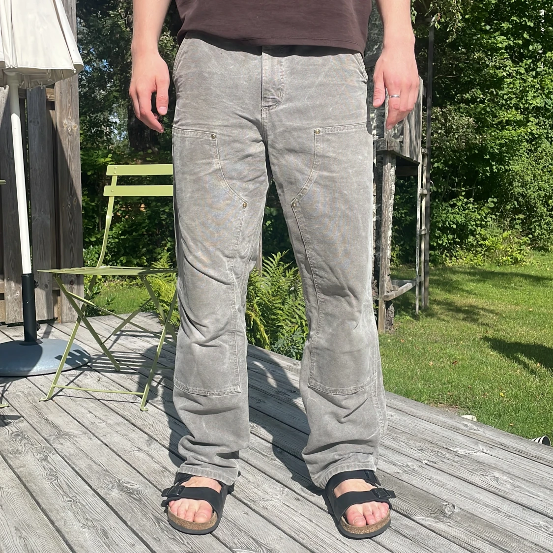 Säljer ett par grå cargopants från Carhartt med flera praktiska fickor och coolt, tvättat utseende. Byxorna har raka ben och en avslappnad passform. Perfekta för dig som gillar streetwear och funktionella detaljer. Klassisk Carhartt-logga på bakfickan. OBS, ena fickan har ett stort hål i sig och tyget börjar sakta spricka i skrevet