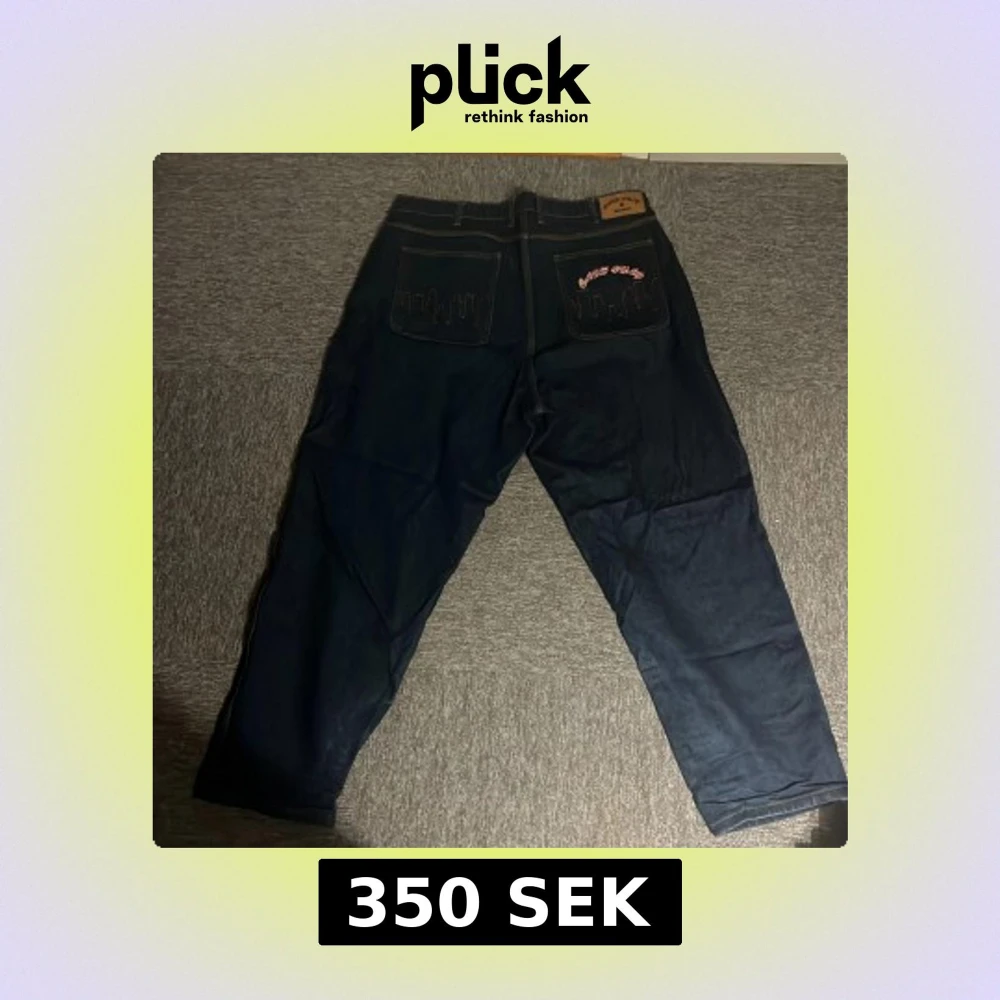 Mörkblå jeans från Cash Only med coolt broderi av stadssilhuett på bakfickorna och röd 'Cash Only'-text. Framficka har ett broderat dollartecken. Klassisk femficksmodell med stora ben och baggy passform. Perfekt för dig som gillar streetwear och unika detaljer.