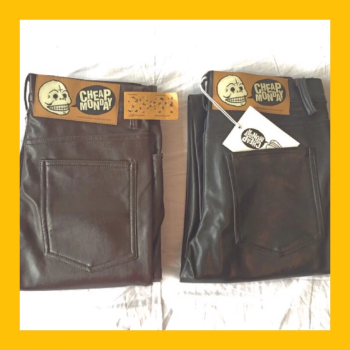 SKINN-/LÄDERBYXOR. Varma byxor med skinn/läderimitation från Cheap Monday. Aldrig använda, det svarta paret har en ögla som gått sönder (?) men det är varken något som syns eller märks. Man kan se det på bilden!
