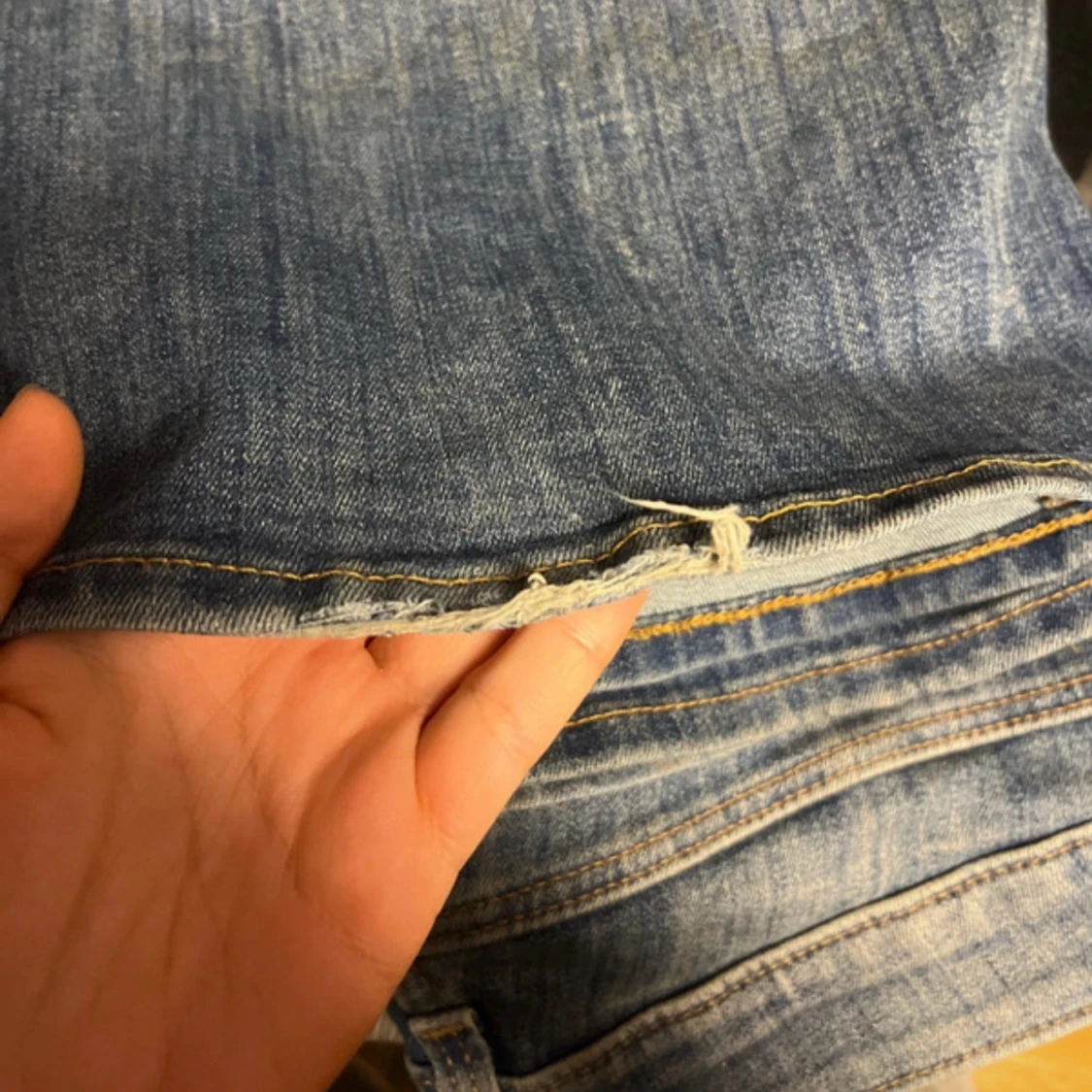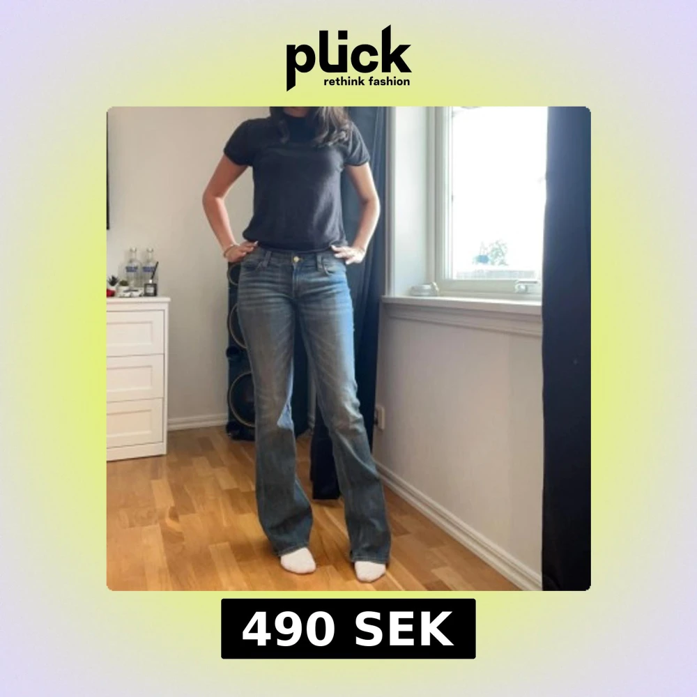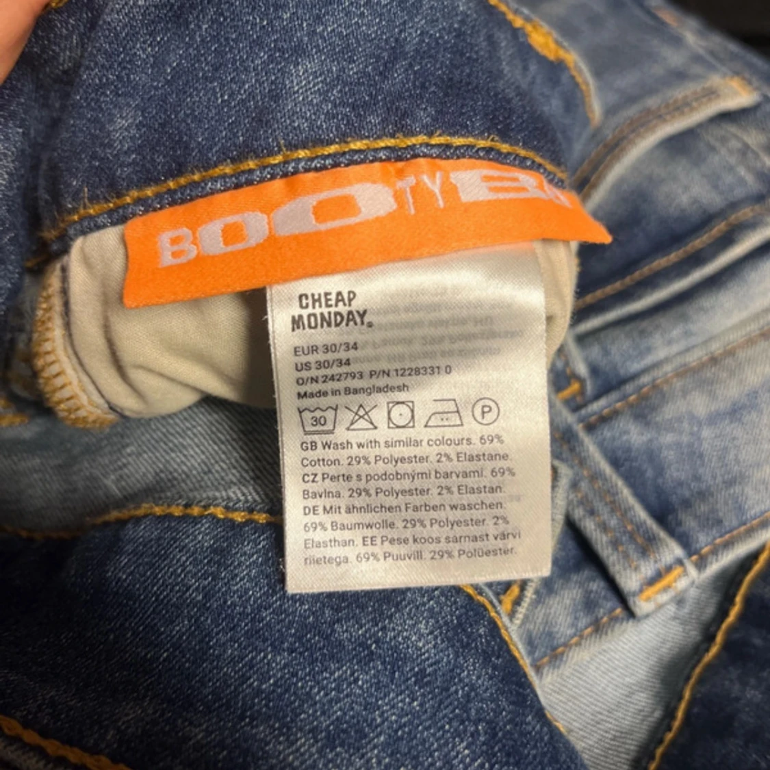 Snygga blå jeans från Cheap Monday med bootcut-modell och klassisk femficksdesign. Jeansen har låg midja och är tillverkade i denim med lätt slitning för en cool look. Perfekta för dig som gillar en avslappnad men trendig stil. Byxorna har precis börjat slitas upp längst ner på vänster ben se sista bilen. Använda max 10 gånger. Storlek 30/34