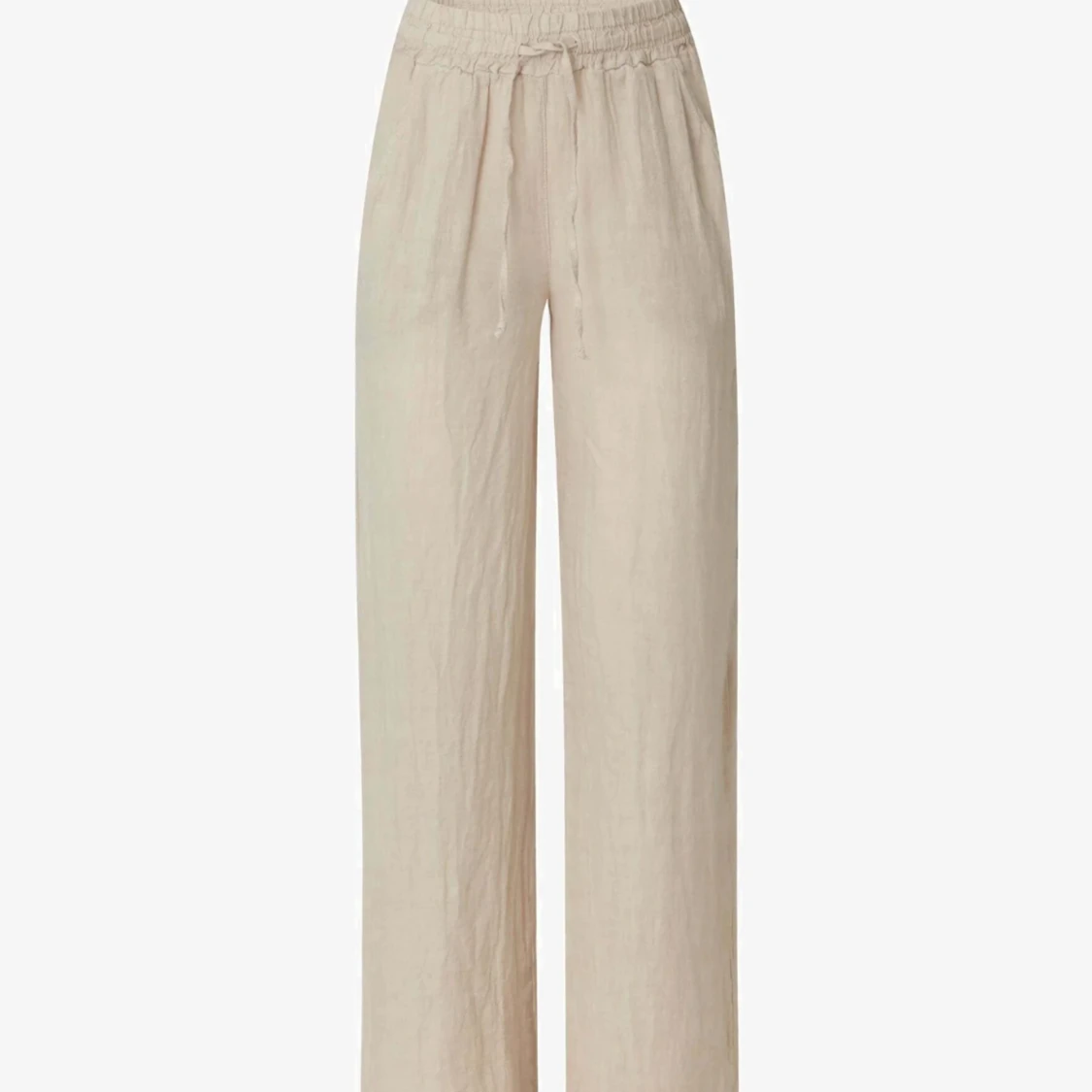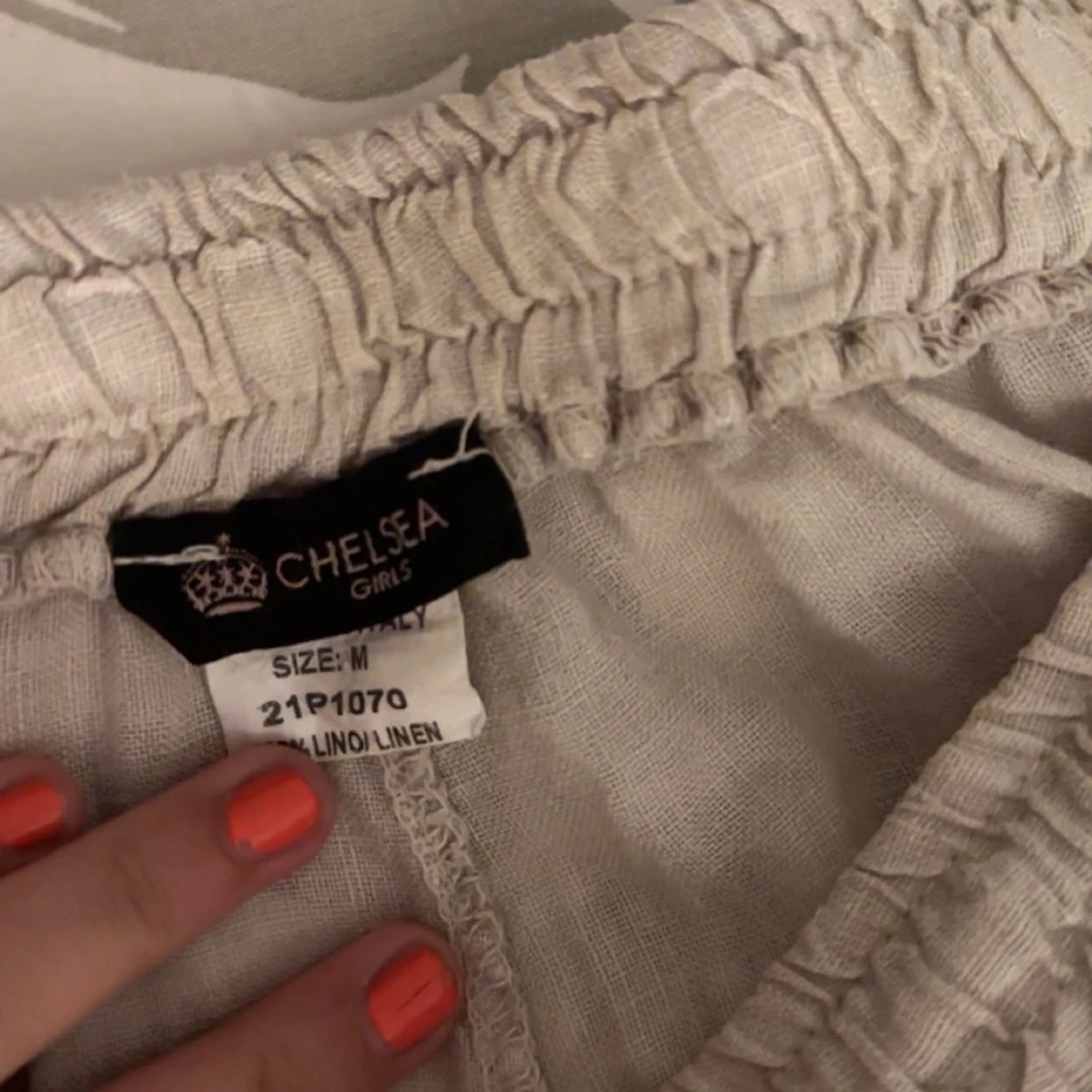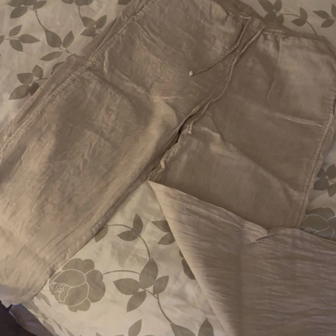 Super fina beiga linnebyxor med medelhög midja. Bra skick, inga fläckar eller hål. Köpta för cirka 1,5 år sedan men ej använts på ungefär 1 år.