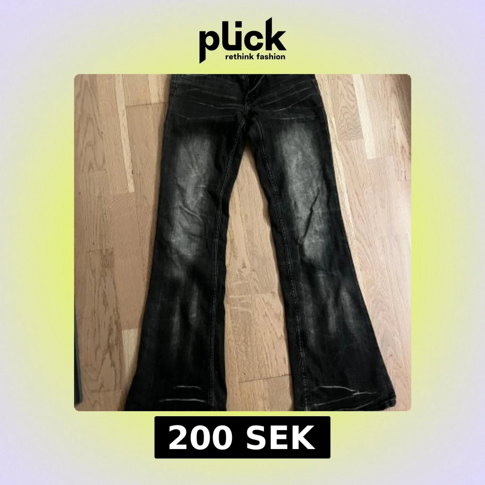 Säljer ett par svarta Cheap Monday eans med bootcut passform. Jeansen har en snygg tvättad look med slitningar och klassisk femficksdesign. Perfekta för dig som gillar en lite mer edgy stil.