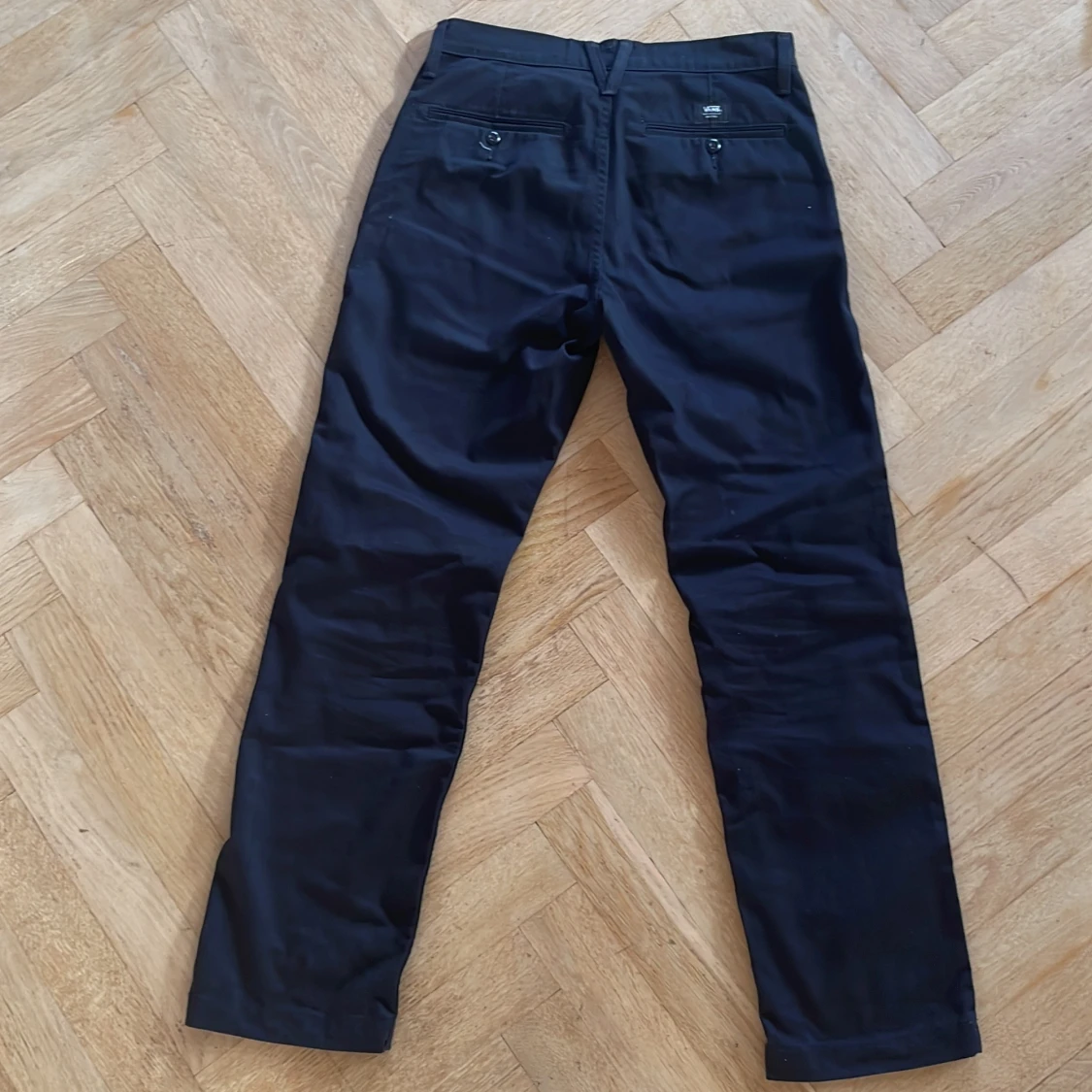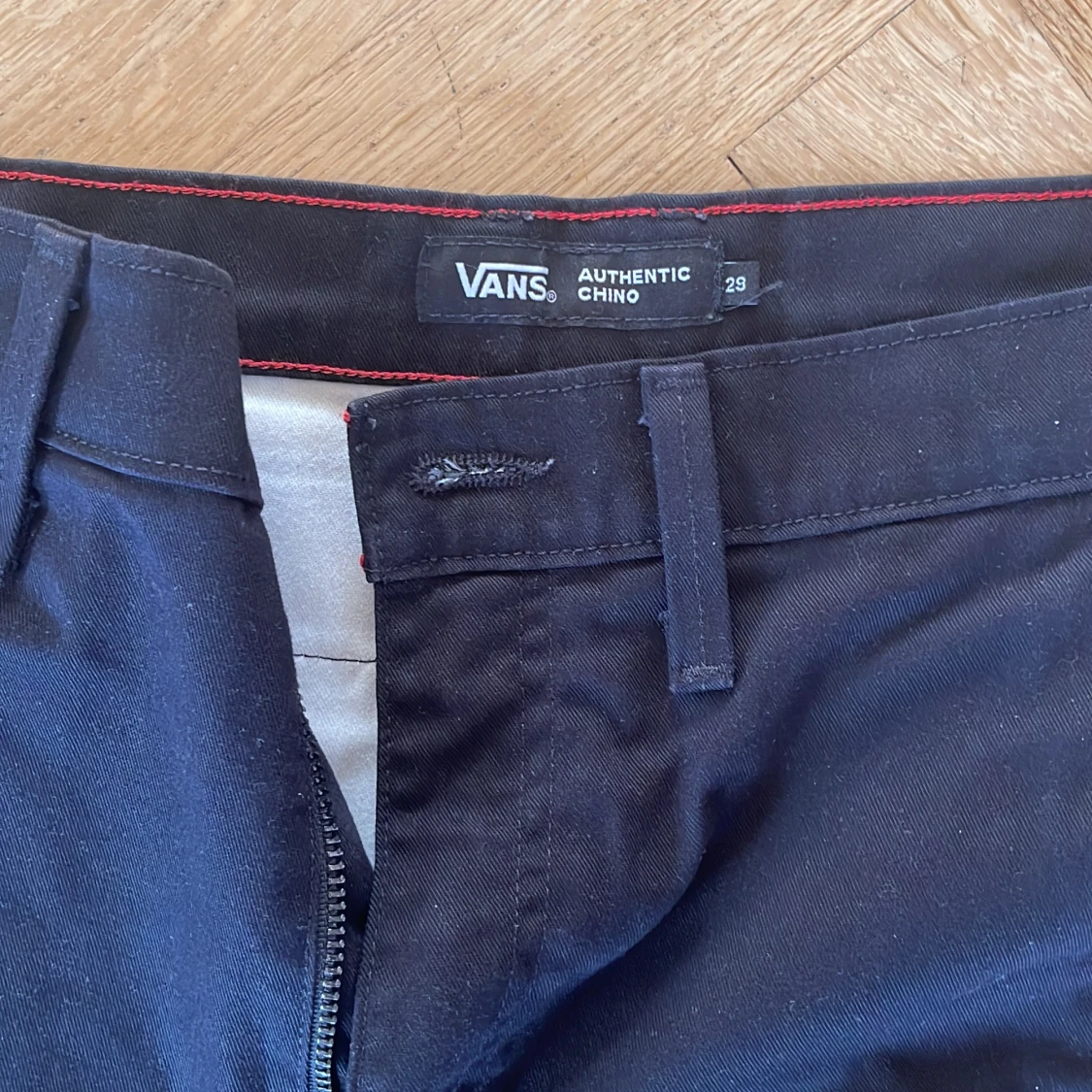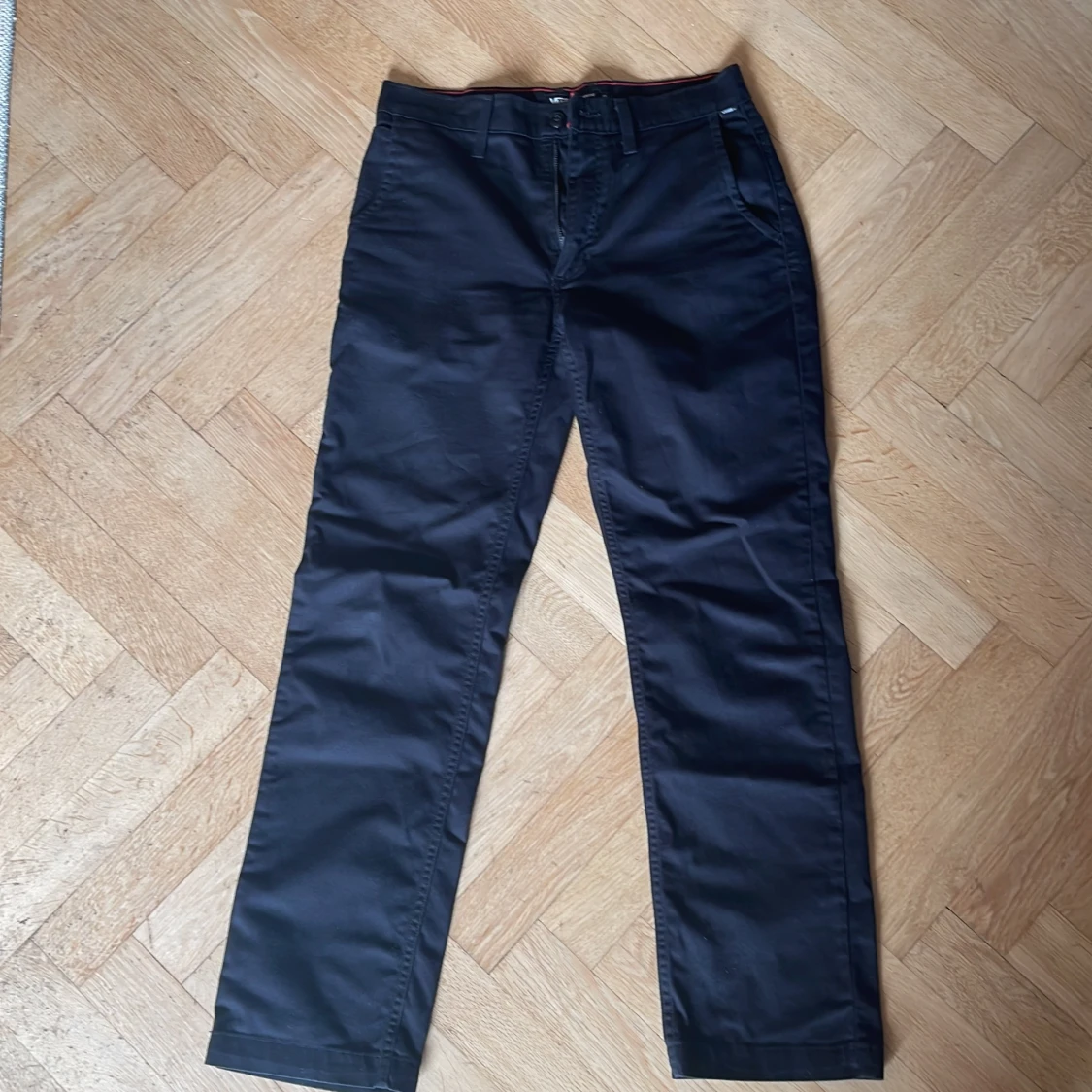 Köparen står för frakten. Säljer ett par svarta Vans Authentic Chino i klassisk rak modell. Förutom att dom är lite skrynkliga är det inget fel på dom. Snygg röd detaljsöm på insidan av linningen.