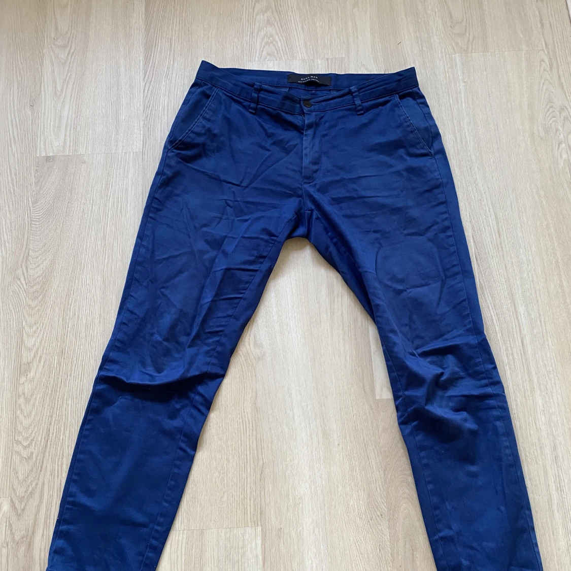 Blåa chinos från Zara. Obetydligt använda. Skrynkligheten visar på var i lådan den legat sedan inköp.