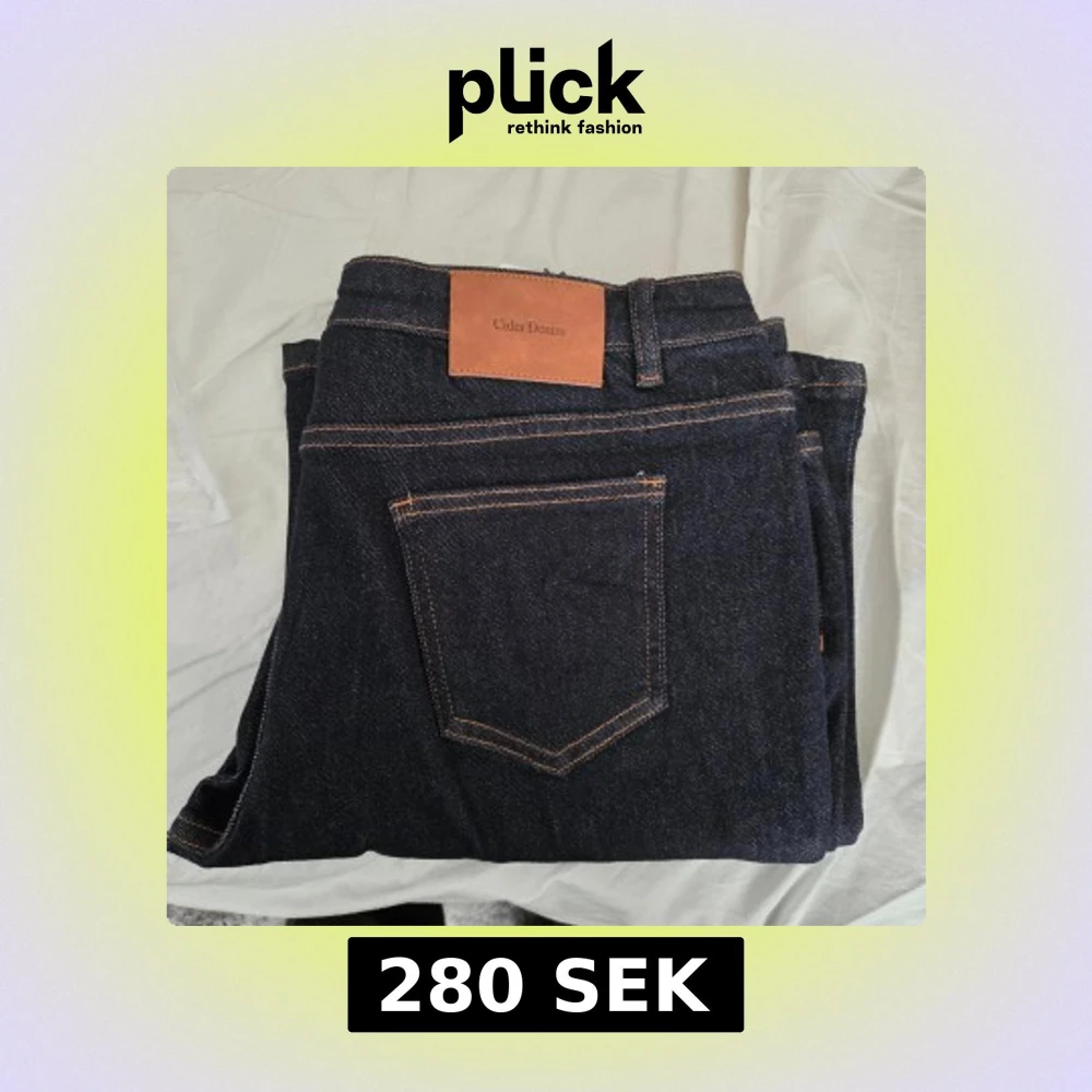 Snygga mörkblå jeans från Cider med klassisk bootcut-passform. Jeansen har fem fickor, kontrastsömmar och en läderpatch bak i midjan. Oanvända då de var fel storlek och retur kunde ej göras. Kostade 422kr ny
