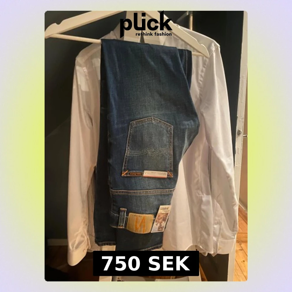 Säljer ett par klassiska blå jeans från Nudie Jeans med orangea sömmar och snygga detaljer på bakfickan. Jeansen har en rak passform och är tillverkade i denim. Perfekta för dig som gillar stilrena och tidlösa jeans med schysst tvätt. De är dessutom HELT NYA! Storlek: W30 L34