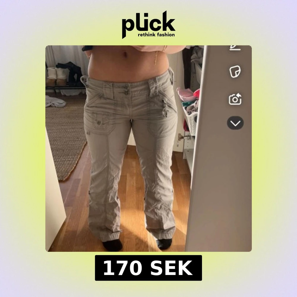 Säljer ett par gråa cargopants med flera fickor och snygga knappar både fram och bak. Byxorna har låg midja och är bootcut med detaljerade sömmar. Perfekta för en avslappnad och trendig stil. Dom är även sudda lågmidjade men inget som märks och går att sprätta upp!