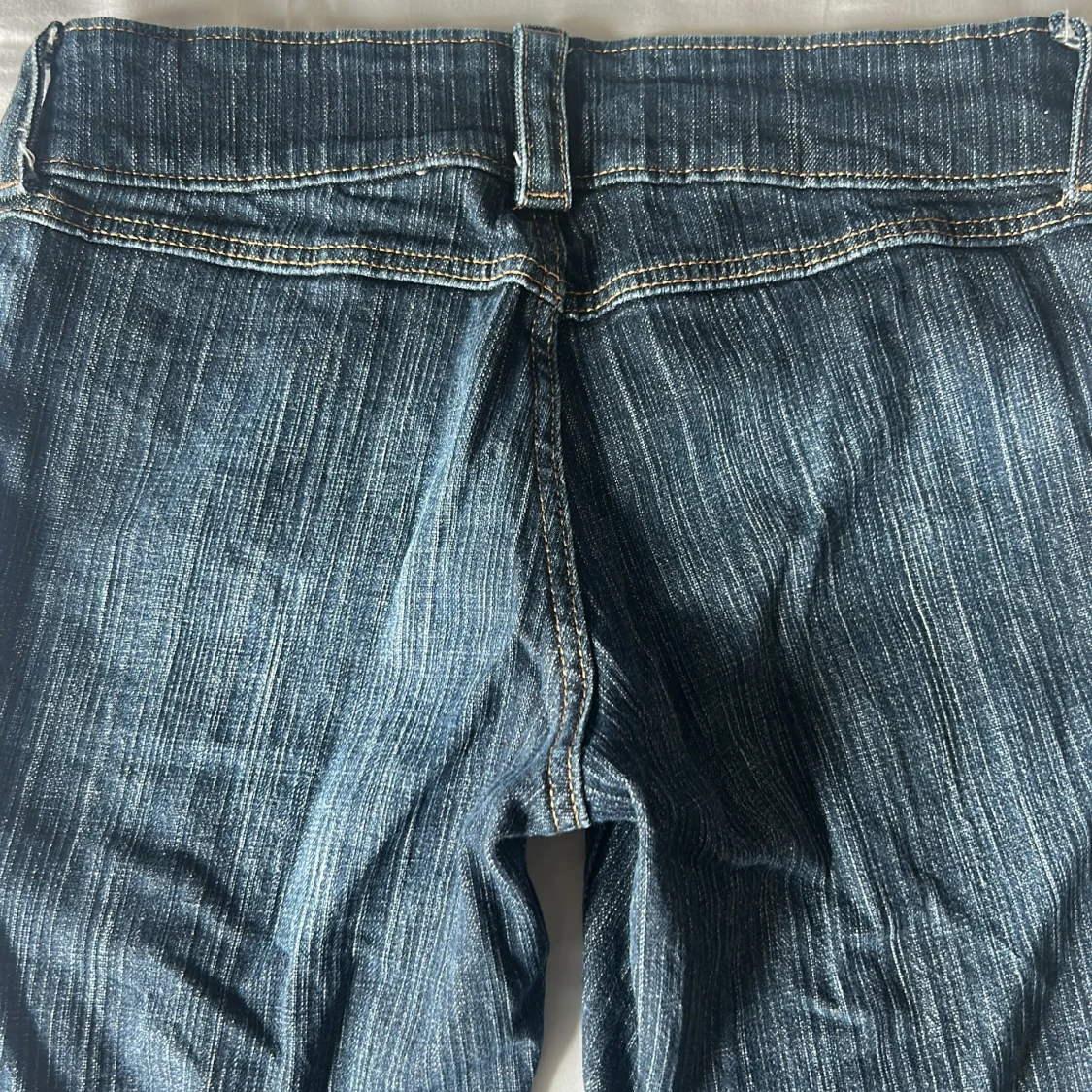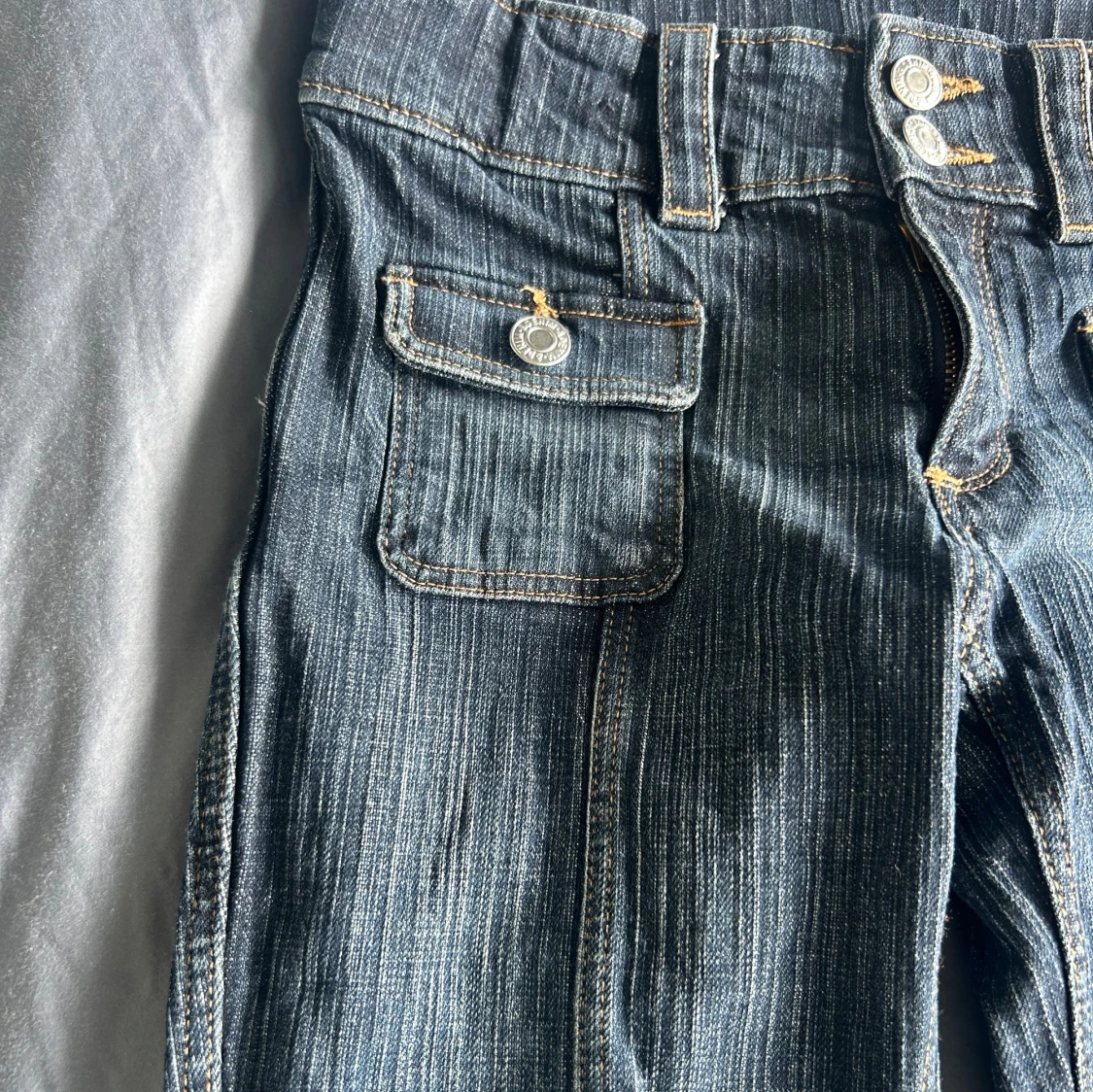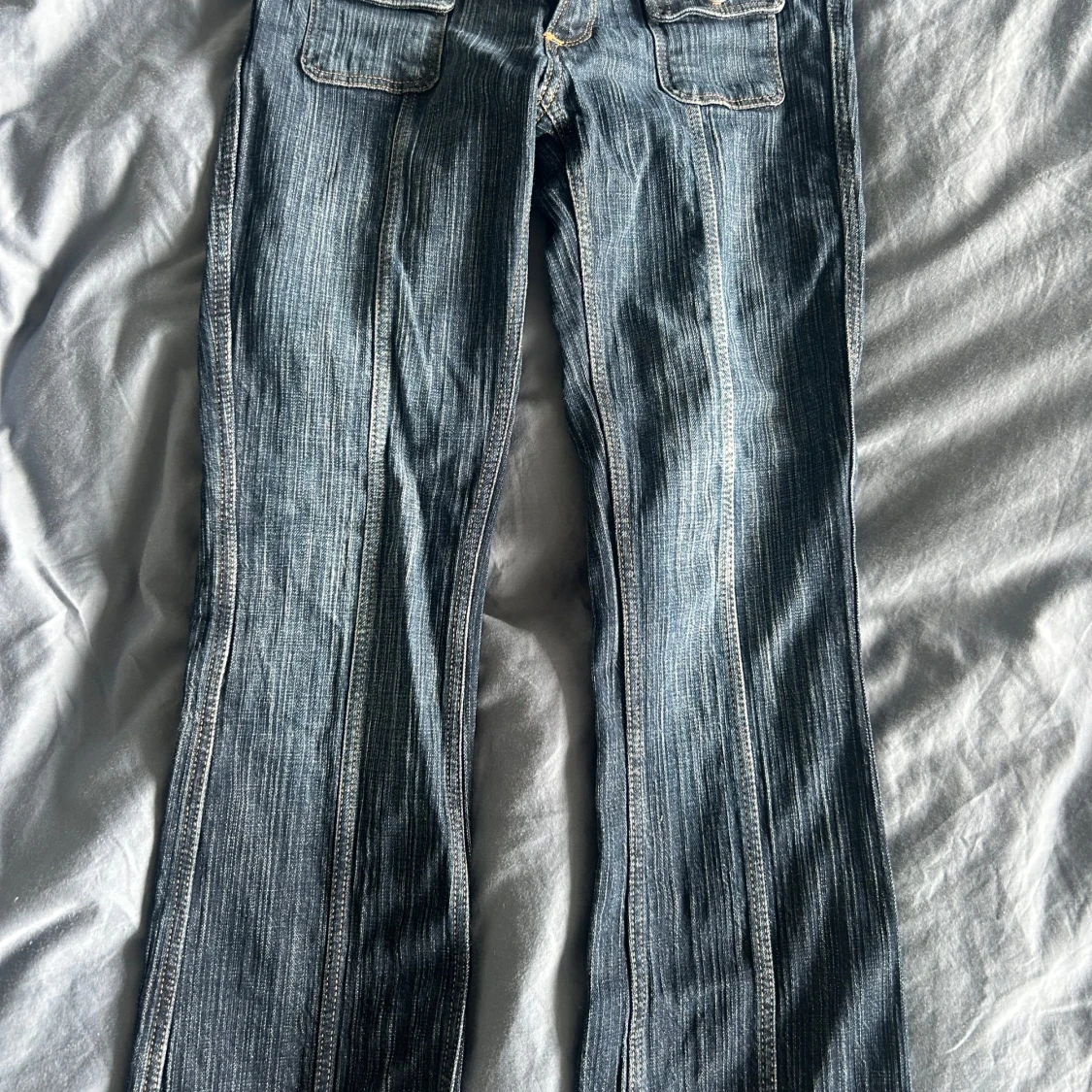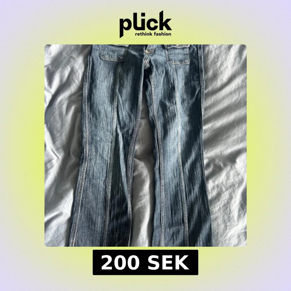 Säljer ett par blå jeans med coola fickor framtill och dubbla knappar i midjan. Inga fickor bak. Jeansen har tydliga vertikala sömmar och en lätt tvättad look. Snygga kontrastsömmar och klassisk jeansstil, perfekta till sneakers eller boots. Säljer på grund av att de tyvärr har blivit lite små😢🩷