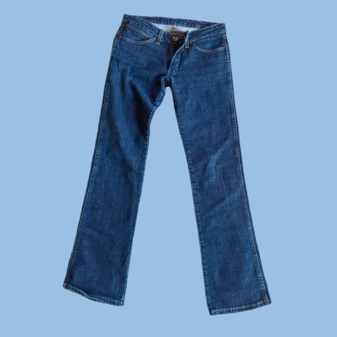 Säljer ett par klassiska blå jeans från Wrangler. De har en bootcut-stil och är i mycket bra skick. Perfekta för både vardag och fest! Jeansmaterialet är slitstarkt och bekvämt. Storleken är dam M.