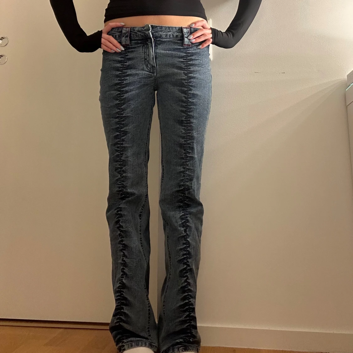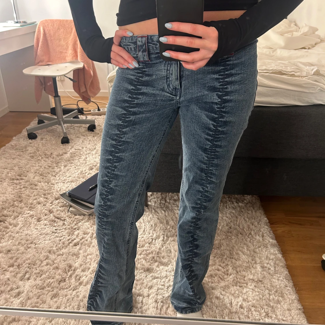 Intressekoll på dessa sjukt snygga lågmidjade bootcut jeans med cool design. Använda en gång men är inte helt säker på om jag vill sälja dem 💞💞i står det 38 men dom passar mig som vanligtvis har 34 eller 36 💞