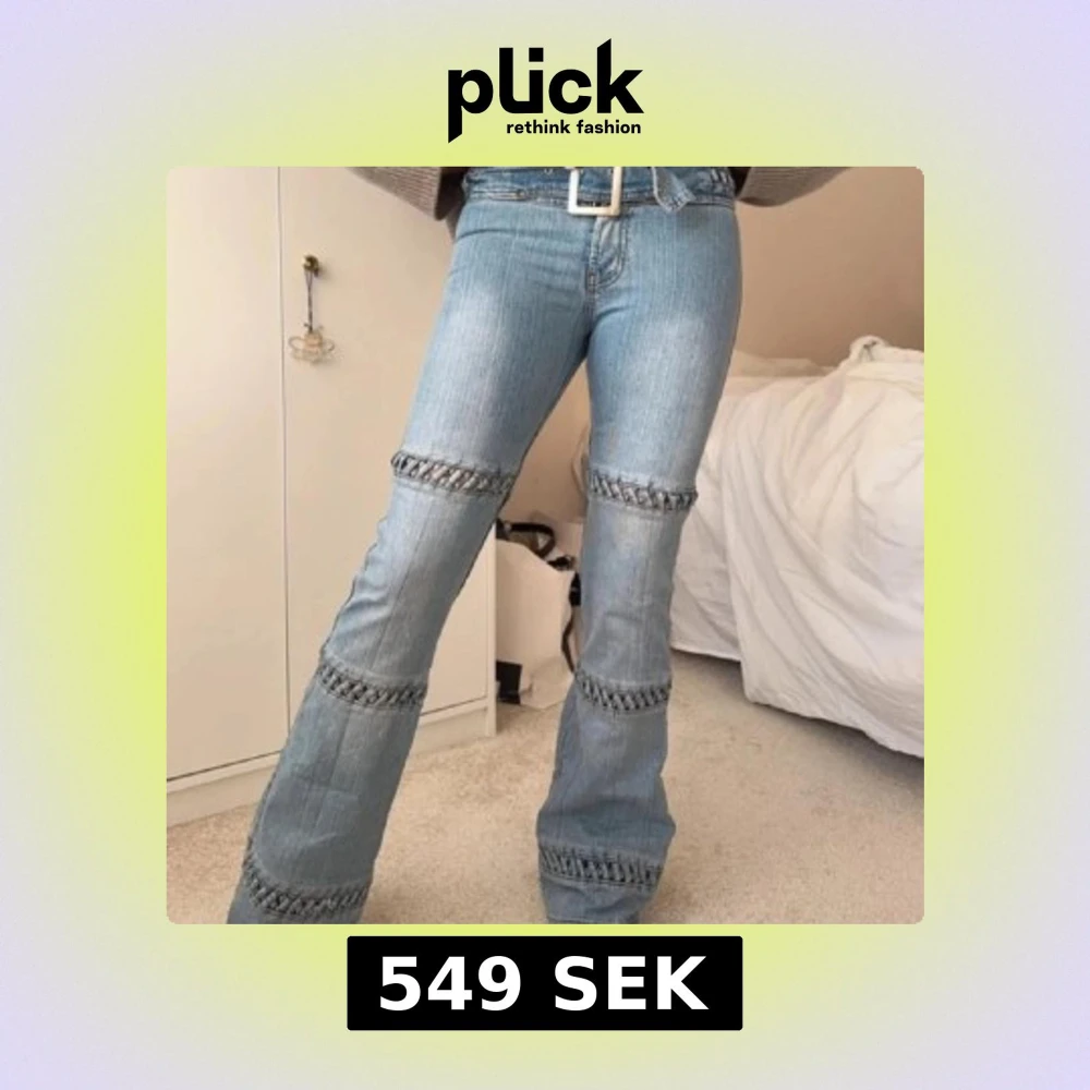 As snygga jeans med coola detaljer!! Innerbenslängden är 82 cm och måttet rakt över midjan 37💕