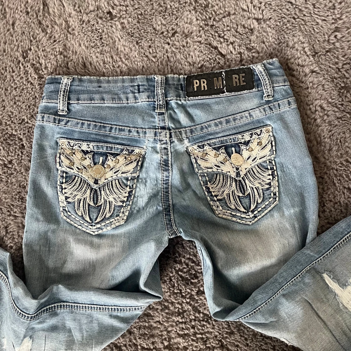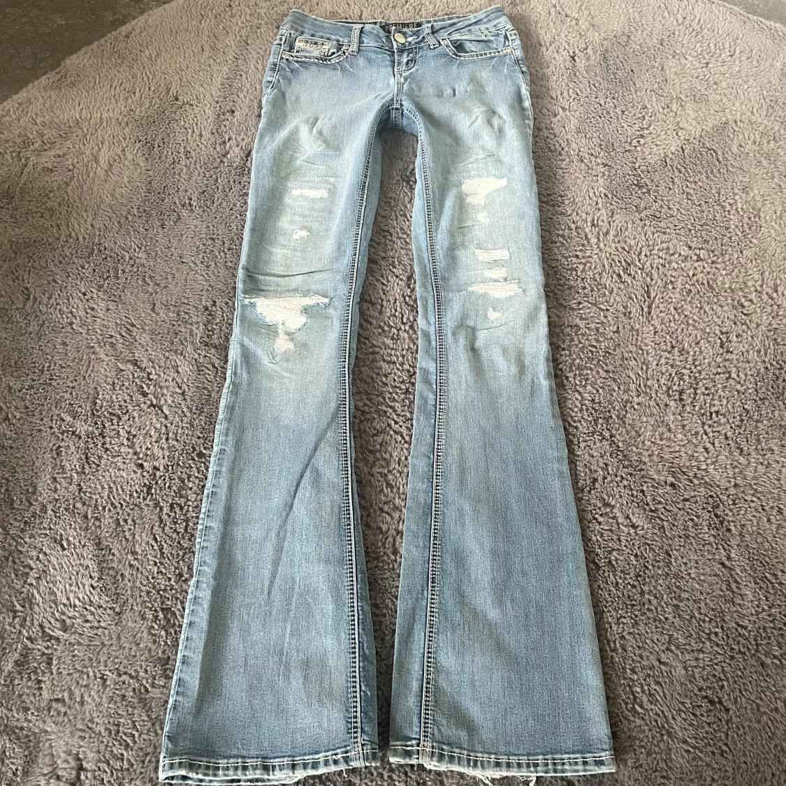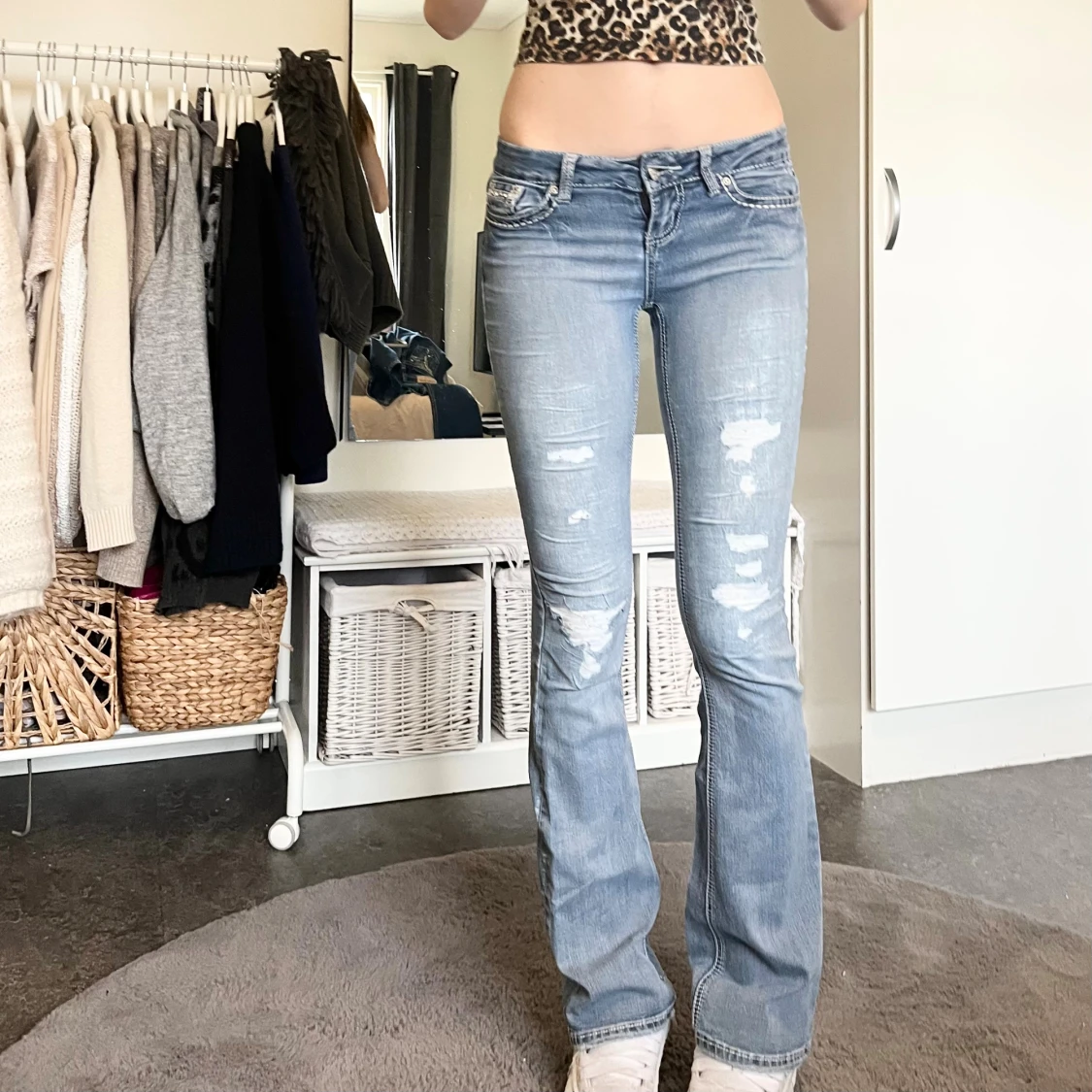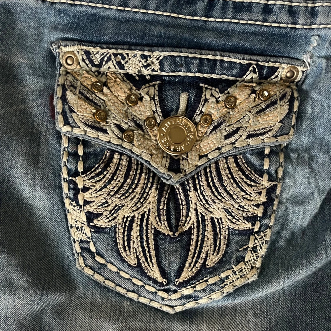 Jeans med as coola fickor. Innerbensländen är 84cm, midjemåttet tvärs över är 35cm och grenhöjden är 18,5cm. Jeansen är i ett stretchiga material, dvs dom anpassas lite efter kroppstyp. Dom är i ett acceptabelt skick, man ser att de används.