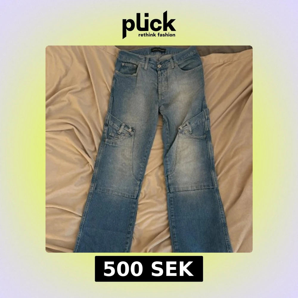 Säljer ett par blå cargojeans från Dolce & Gabbana med flera fickor och coola sömdetaljer. Jeansen har raka ben och klassisk knappstängning med D&G-logga. Tyvärr för små på mig nu.