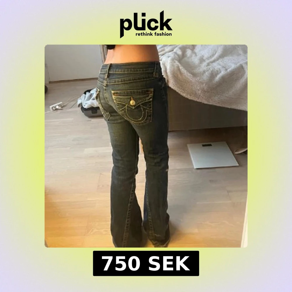 Snygga mörkblå jeans med bootcut och låg midja. De har dekorativa fickor bak med knappar och kontrastsömmar. Vintage och slitna längst ner, skriv för bilder på det! Innerbenet är 79