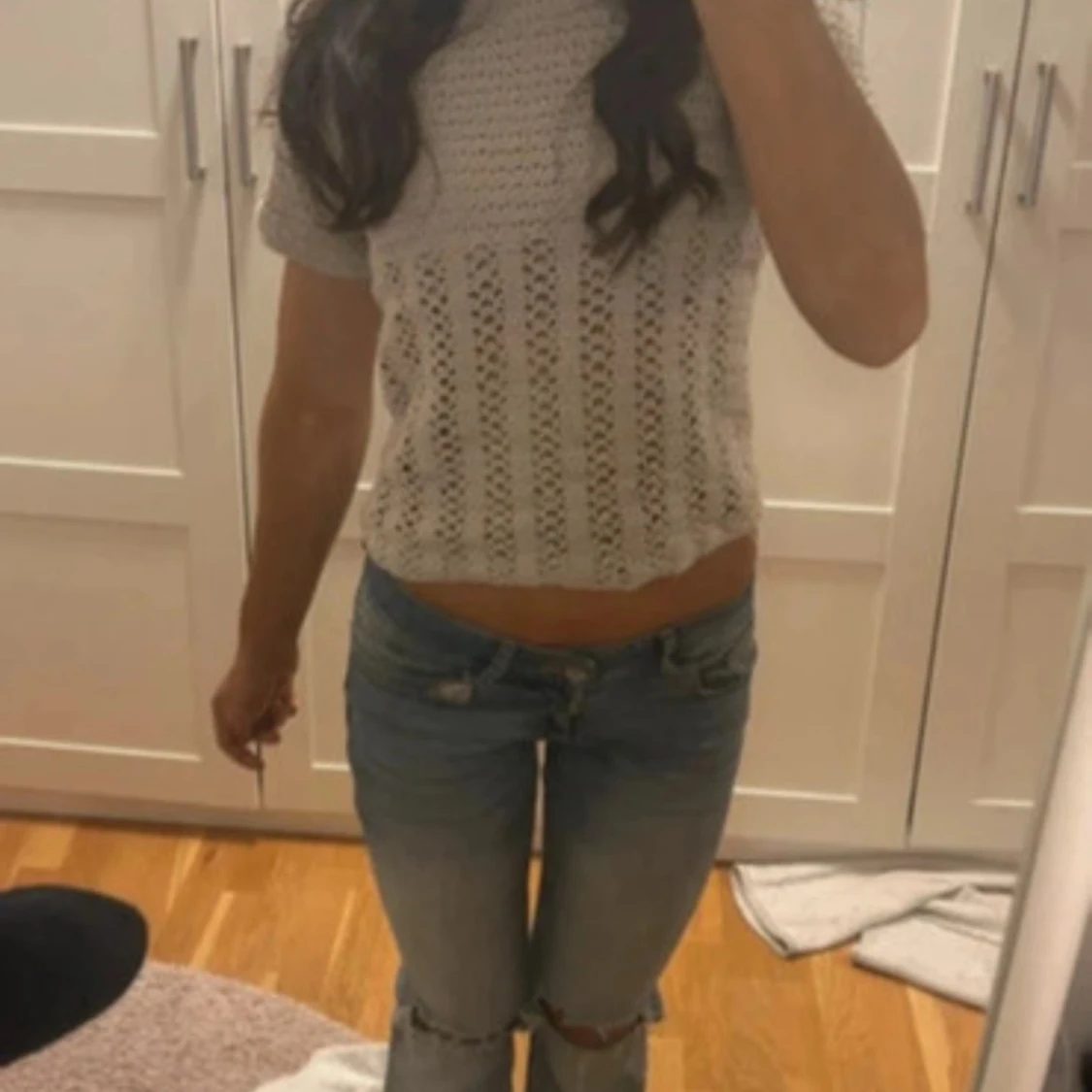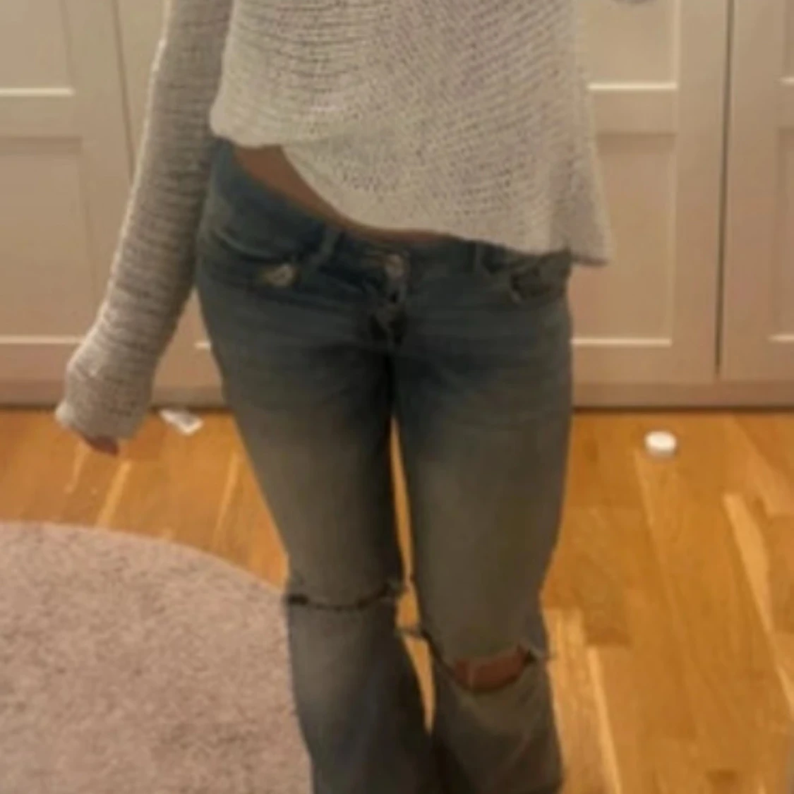 Säljer ett par ljusblå jeans med låg midja och bootcut-modell. Jeansen har slitningar och hål vid knäna för en trendig look. Klassisk femficksdesign och tillverkade i denim. Perfekta för dig som gillar en avslappnad och cool stil.