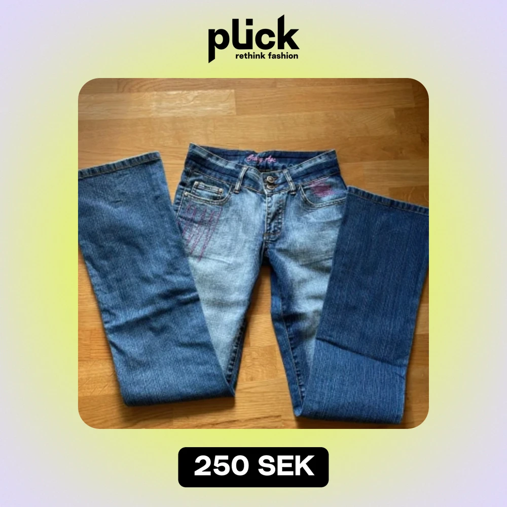 Blå lågmidjade crazy age jeans med rosa detaljer. Midjemåttet tvärs över är 32cm och innerbenslängden är 71cm. Sista bilden är lånad från en tidigare säljare. Skriv om du har frågor eller för fler bilder🩷