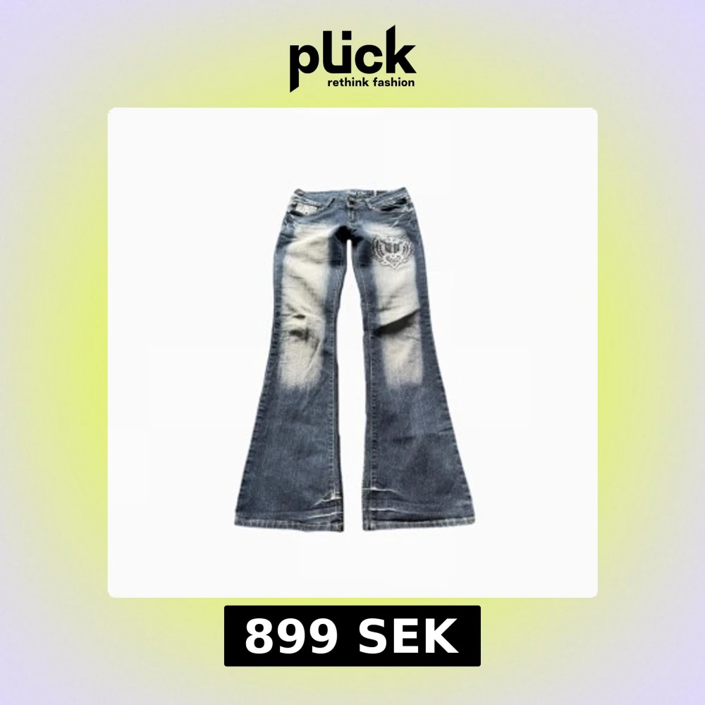 Sjukt snygga crazy age jeans med röda detaljer, de är i jättebra skick inga stenar eller något saknas!🪽💋 Storleks lappen är avklippt så gå efter mått men skulle säga att de är 34/36. <3 Midjemått = 38cm innerbenslängd= 82cm lår= 21cm !