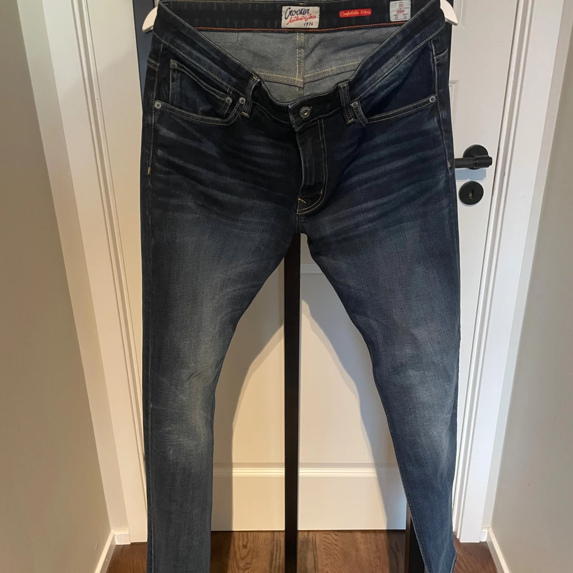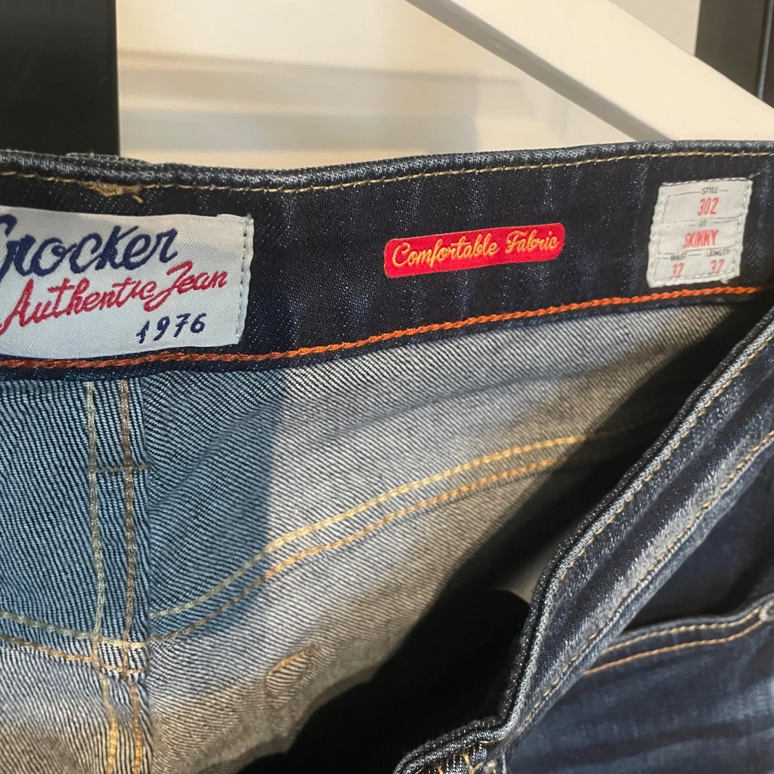 Snygga blå skinny jeans från Crocker med klassisk femficksdesign och bekvämt stretchigt tyg. Jeansen har en mörk tvätt med slitningar och kontrastsömmar, perfekt för en trendig och avslappnad look.