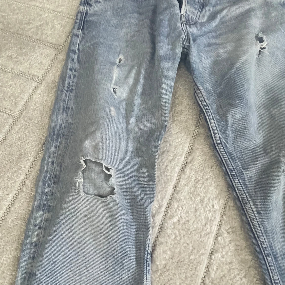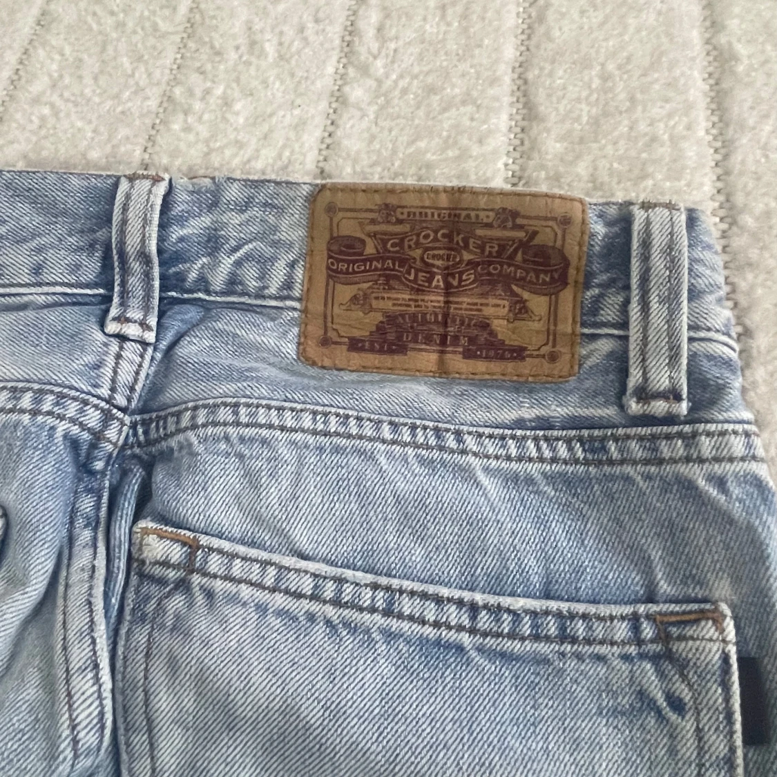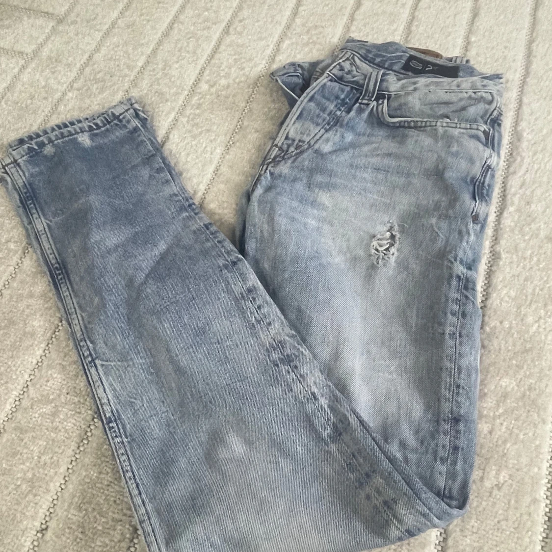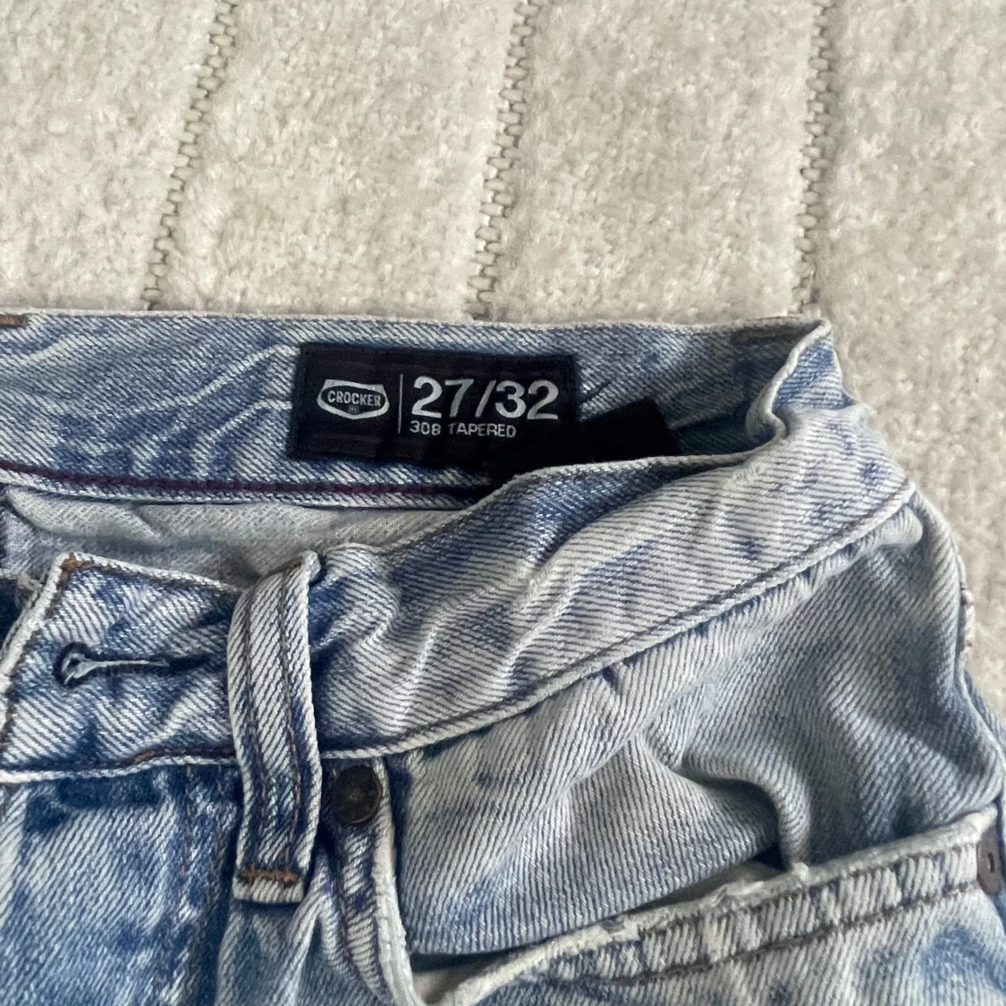 Säljer ett par ljusblå jeans från Crocker i modellen 308 Tapered. Jeansen har flera slitningar och hål på benen för en cool, avslappnad look. Klassisk femficksdesign och rak passform. Perfekt för dig som gillar streetstyle.