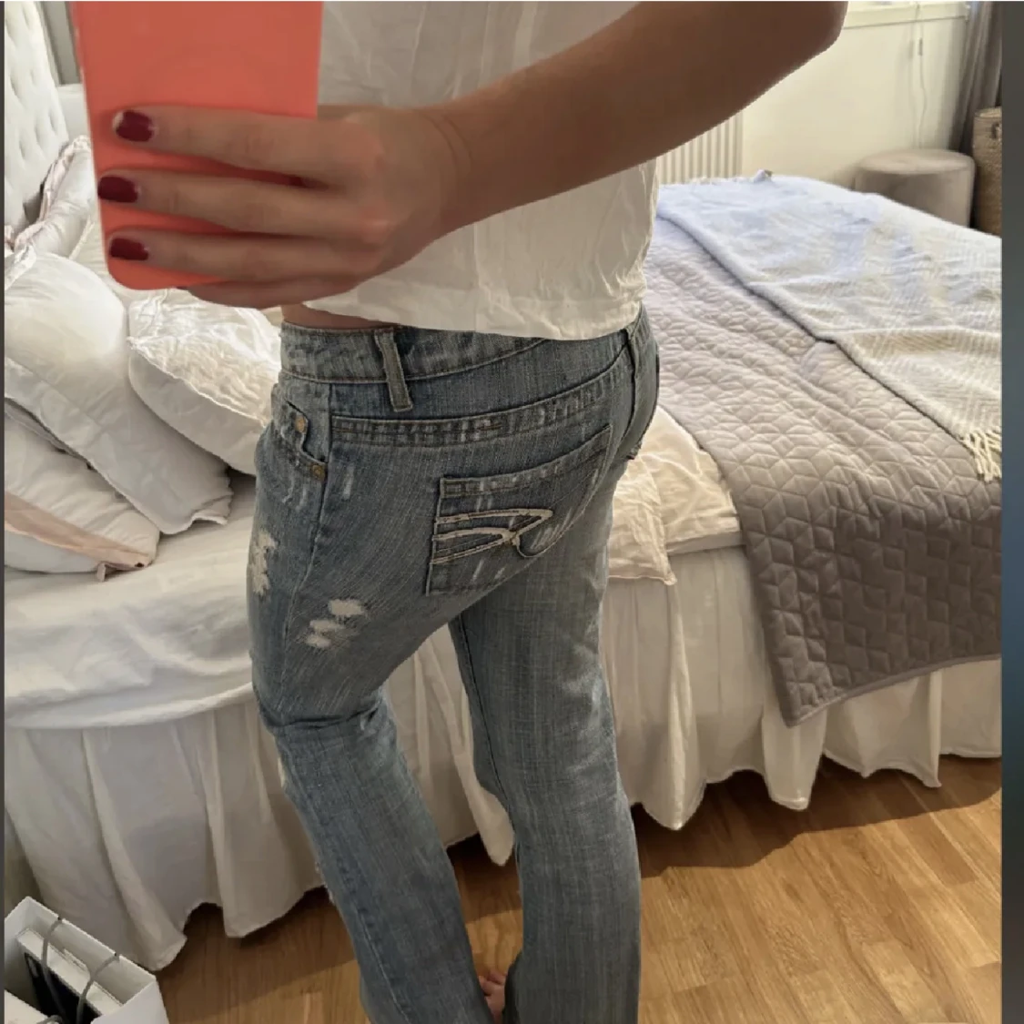 Säljer detta jeans vidare då dem tyvärr inte passade mig! Köpa på plick och tidigare ägarens bilder💞storlek 40 men skulle säga att de passar 38 bättre och eventuellt 36 beroende på hur man vill att dem ska sitta! Tjejen på bilderna är 175