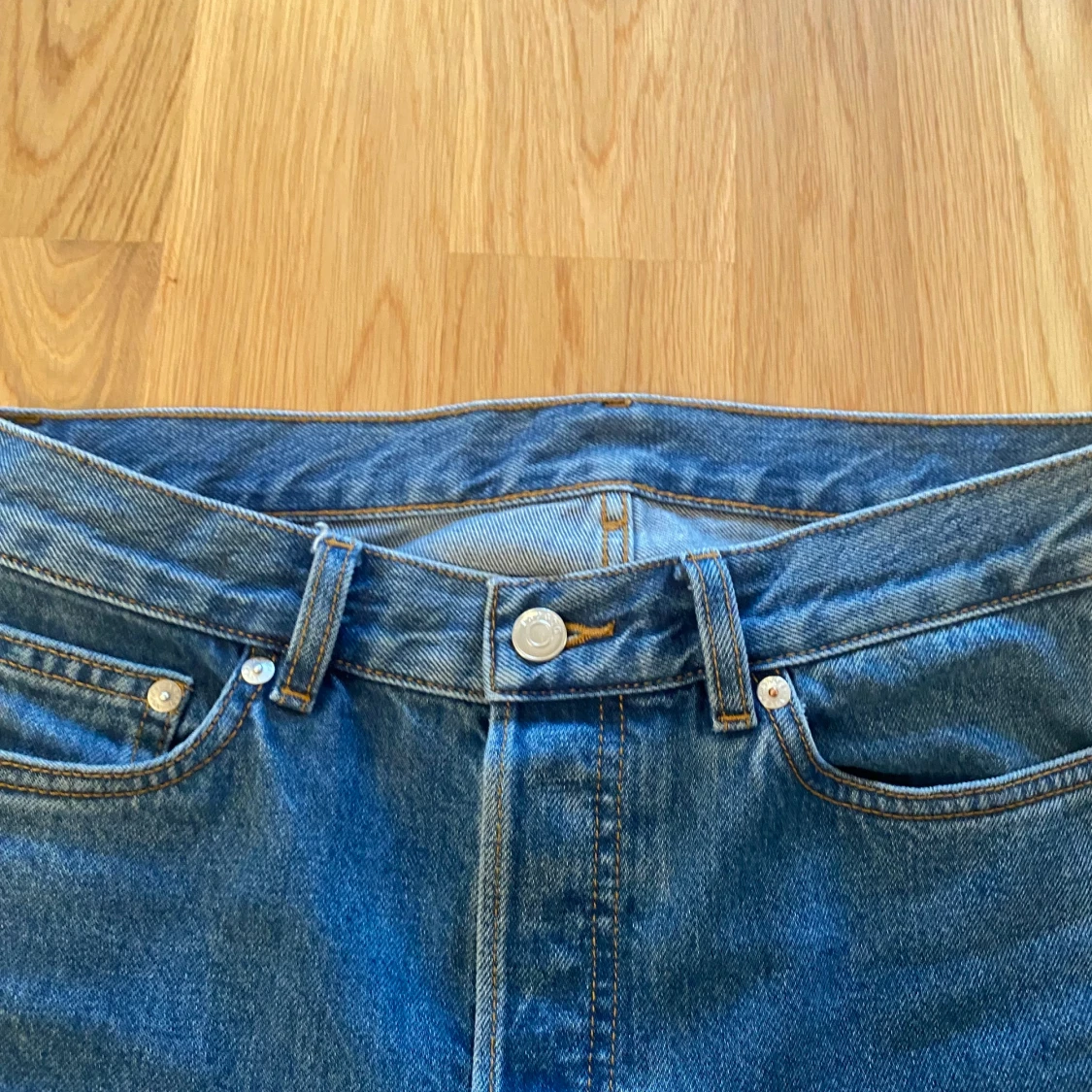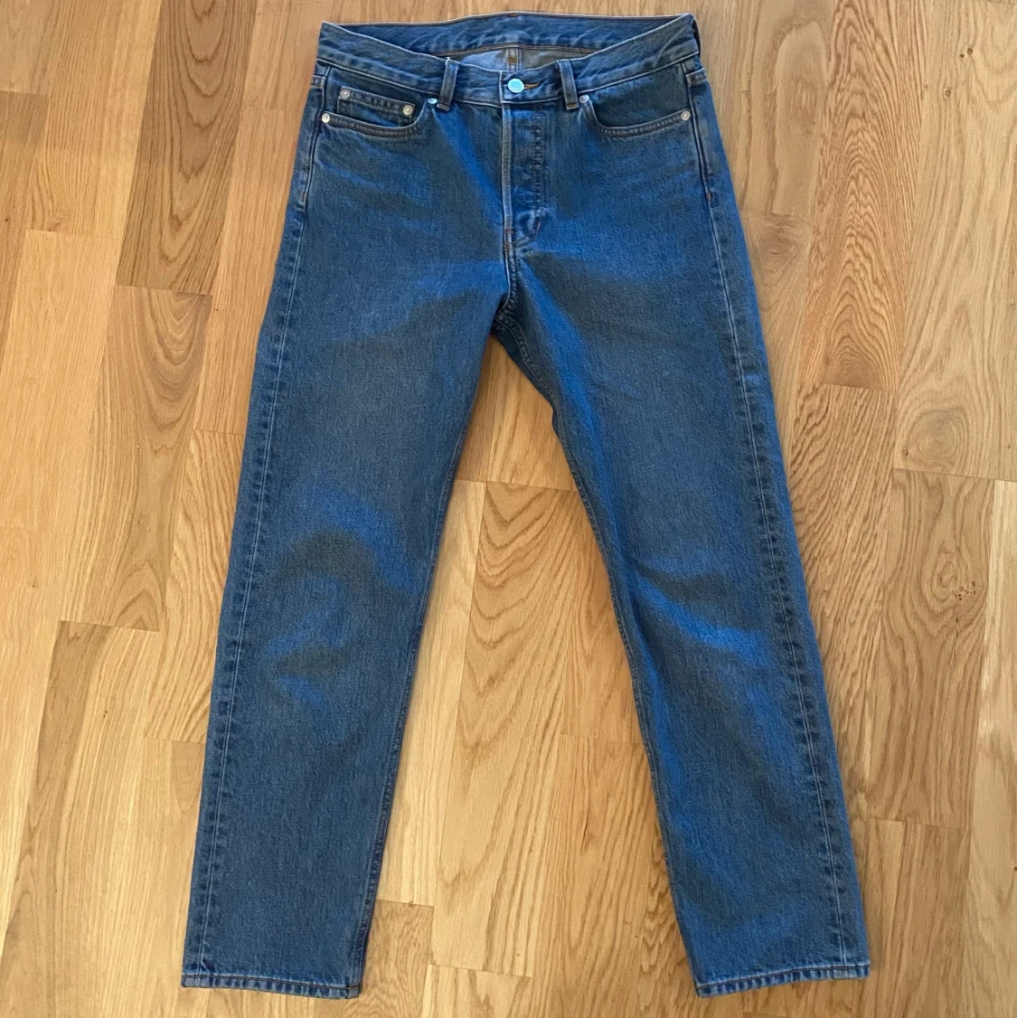 Knappt använda jeans från Arket, i färgen blå. De är cropped och relativt ”baggy” passform. 100% organisk bomull.