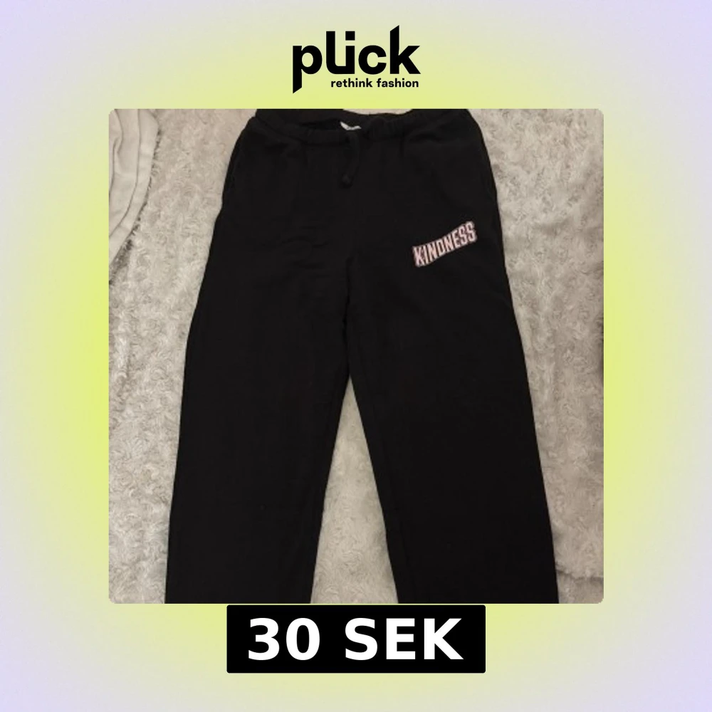 Barn storlek. Svarta mjukisbyxor med elastisk midja och snörning. På ena benet finns ett rosa och vitt tryck med texten 'KINDNESS'. Byxorna ärlössittande med resor vid anklerna och tillverkade i mjukt bomullsmaterial, perfekta för chill dagar.