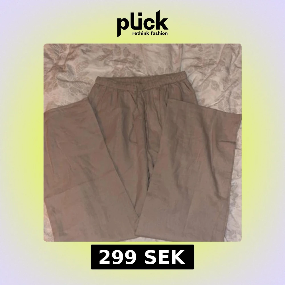 Säljer ett par beige linnebyxor med elastisk midja. Perfekta för en avslappnad dag hemma eller en dag i sommar. Byxorna har en loose passform som ger extra komfort. Aldrig använda, lappen är kvar☺️