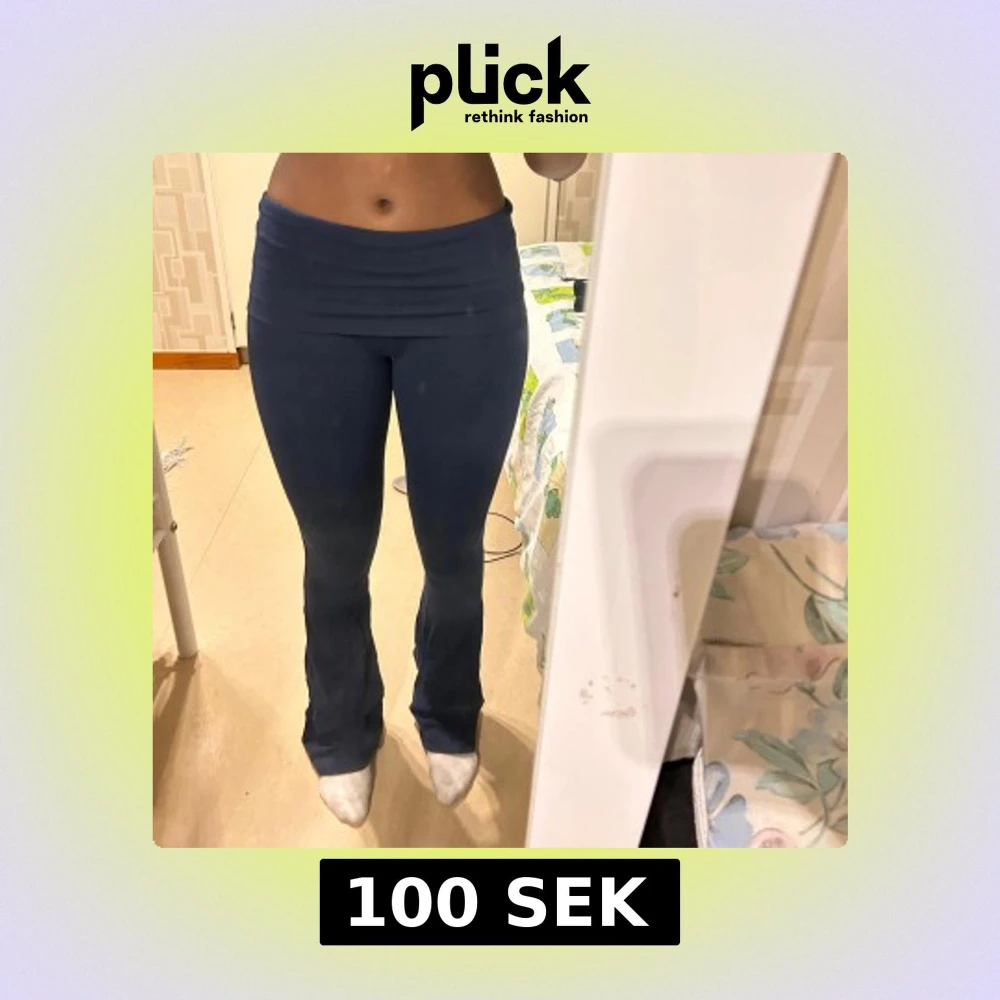 Mörkblå byxor i stretchigt material med normal passform. Modellen är enkel utan synliga detaljer och har långa ben.