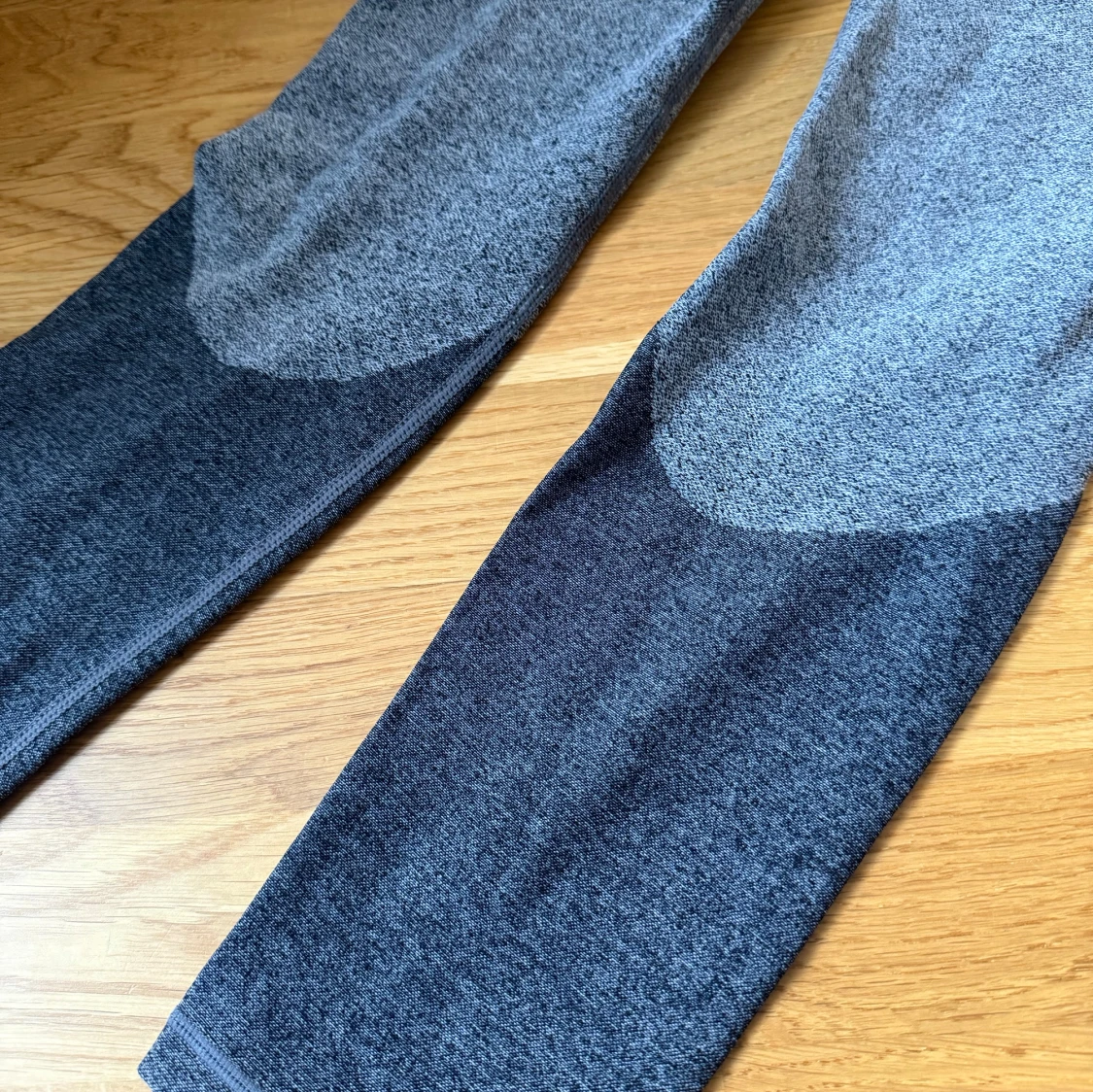 Mörkgrå och ljusgrå träningstights från Cubus i storlek L. De har bred midja och snygga kontrastpaneler på benen. Perfekta för gymmet eller löprundan, med stretchigt och mjukt material som sitter skönt hela dagen.