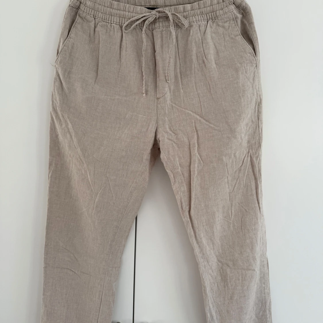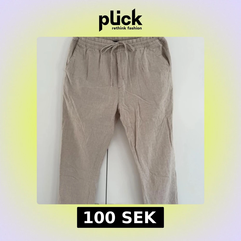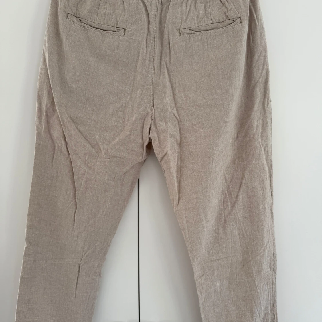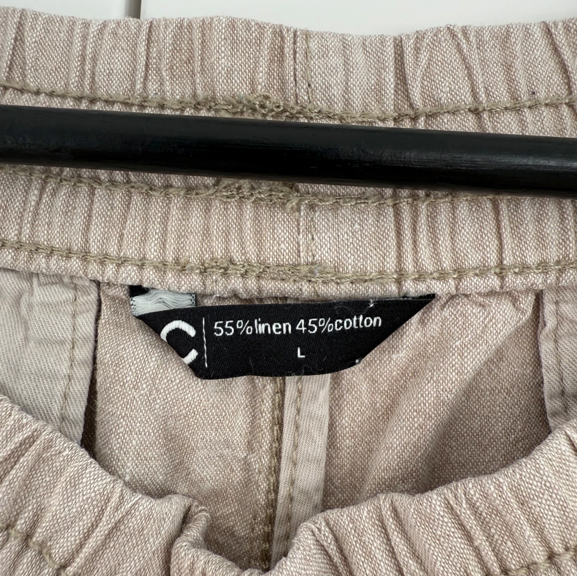 Snygga beiga linnebyxor i storlek L med dragsko i midjan och fickor både fram och bak. Perfekta för varmare dagar. Avslappnad passform och stilren look.