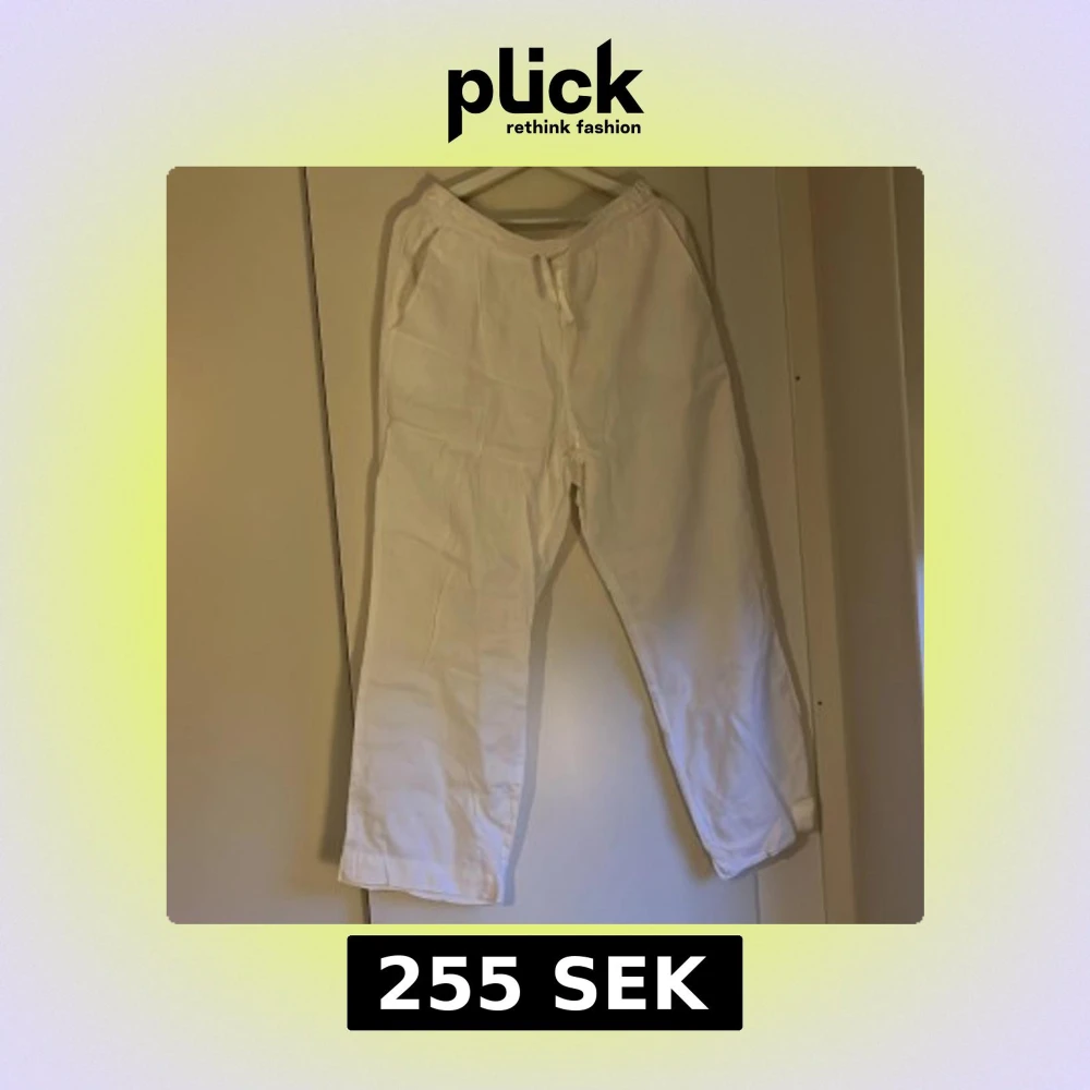 Säljer ett par vita linnebyxor med snörning i midjan. Byxorna har en avslappnad passform och är perfekta för en bekväm dag hemma. De har elastisk midja och är tillverkade i ett mjukt material. Perfekt för varma sommarnätter. Använda en gång.