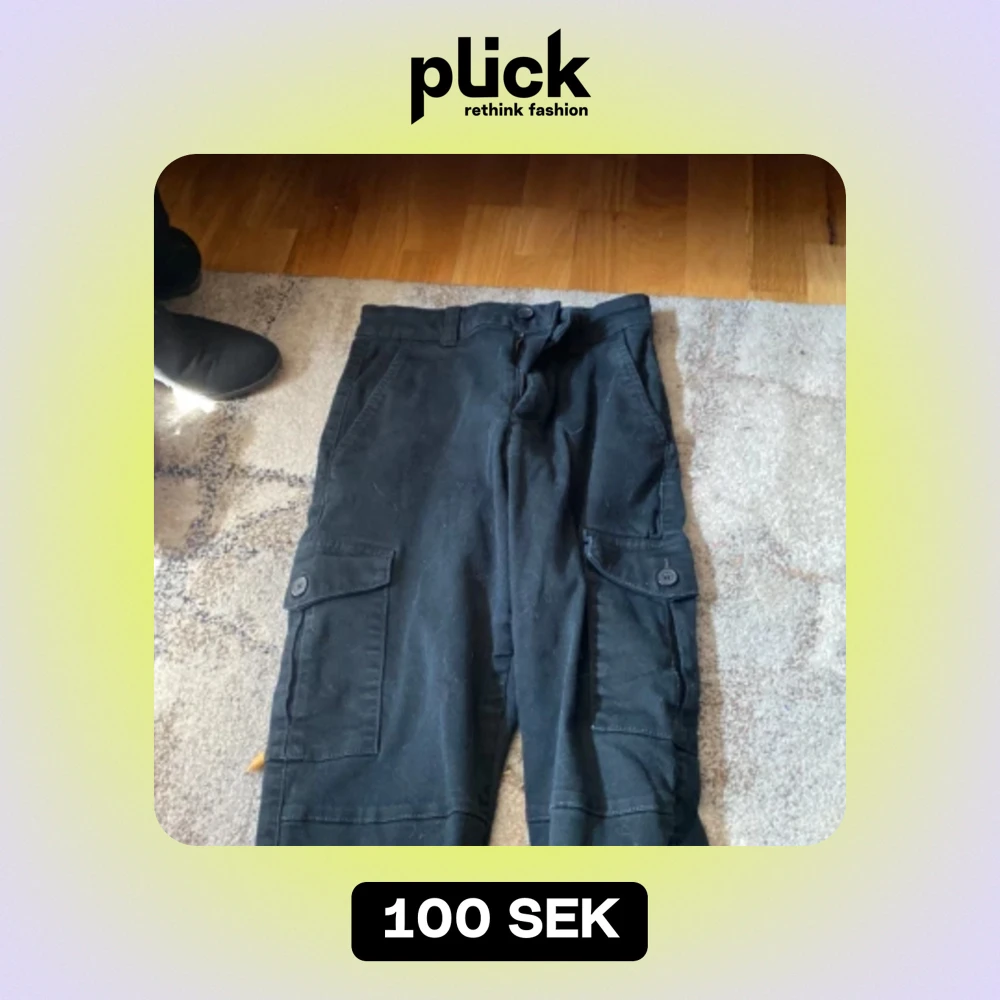Ett par svarta typ jeans men jag fickor på sidan av benet och fejkfickor där bak