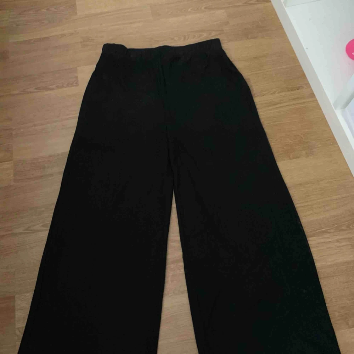 Svarta utsvängda byxor i glansigt tyg, används inte längre pga för korta för mig🧡