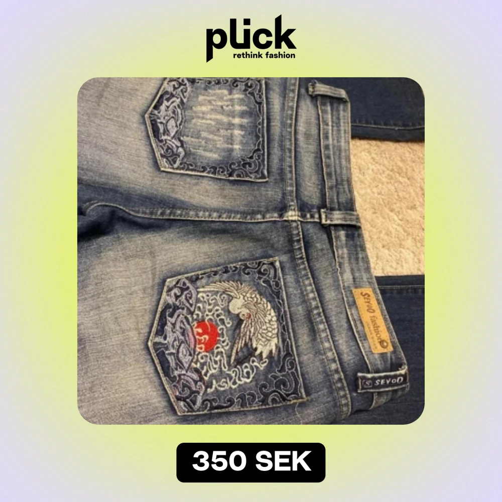 Så snygga lågmidjade vintage jeans men supercoola fickor från märket seyoo. 💕💕💕 Midjemått: 80 cm Innerbenslängd: 76 cm Skriv för mer information💕💕