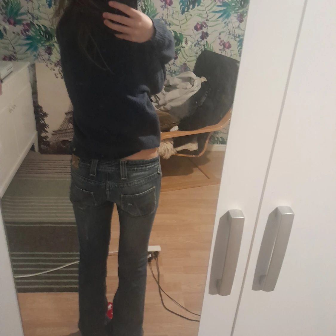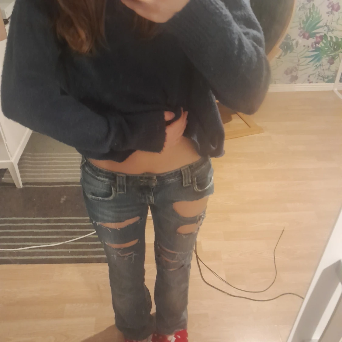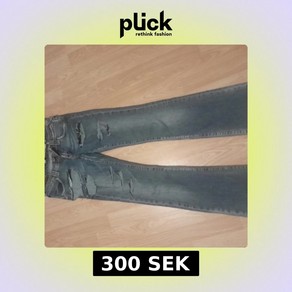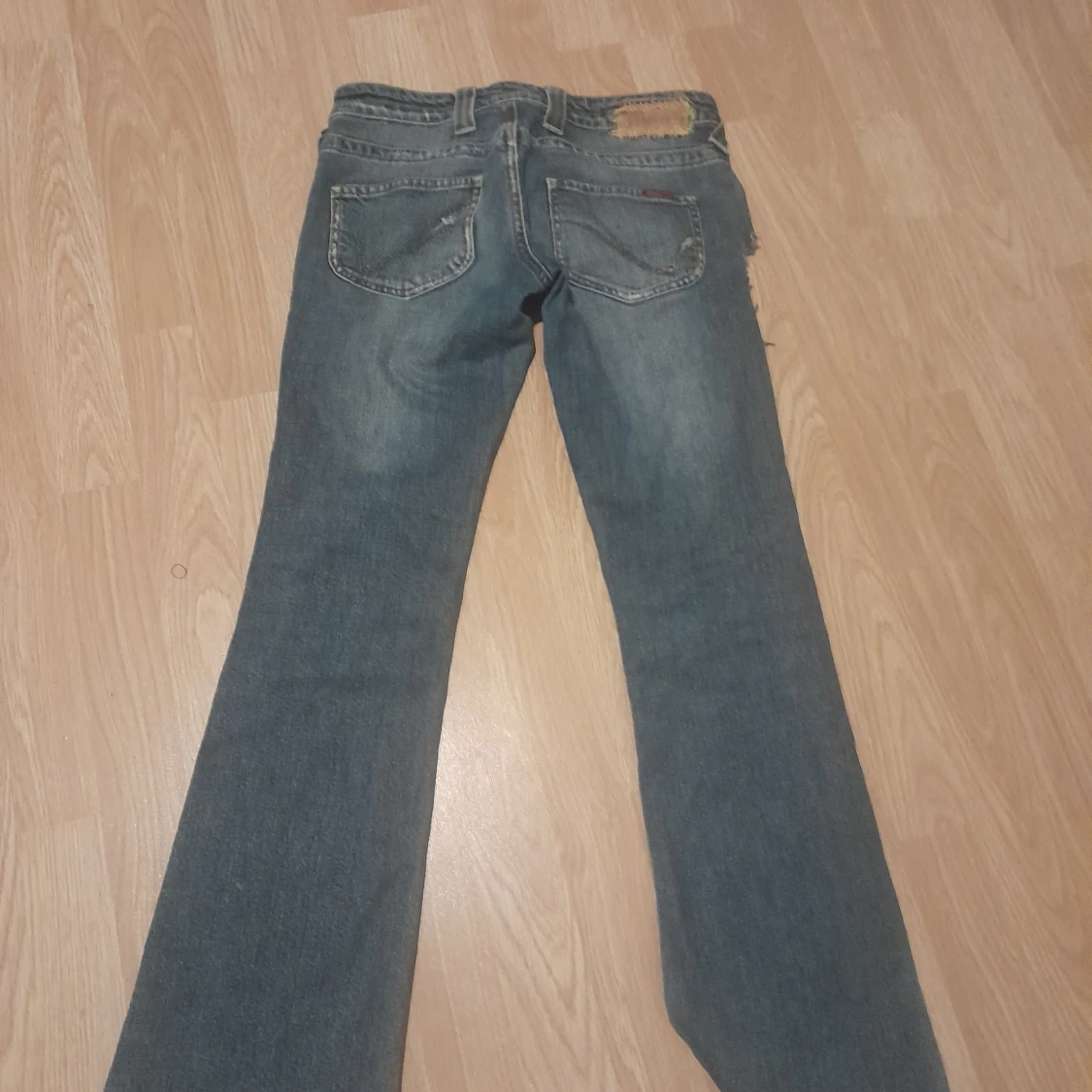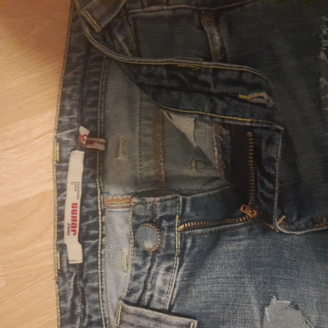 Säljer ett par blå jeans från Onlyjeans med låg midja och bootcut-ben. Jeansen har flera stora slitningar och hål framtill för en riktigt edgy look. Klassisk femficksmodell med dragkedja och knapp. Perfekta för dig som gillar streetstyle. Midjemått:35 Innerbenslängd: 76. Skriv om ni har några fler frågor!