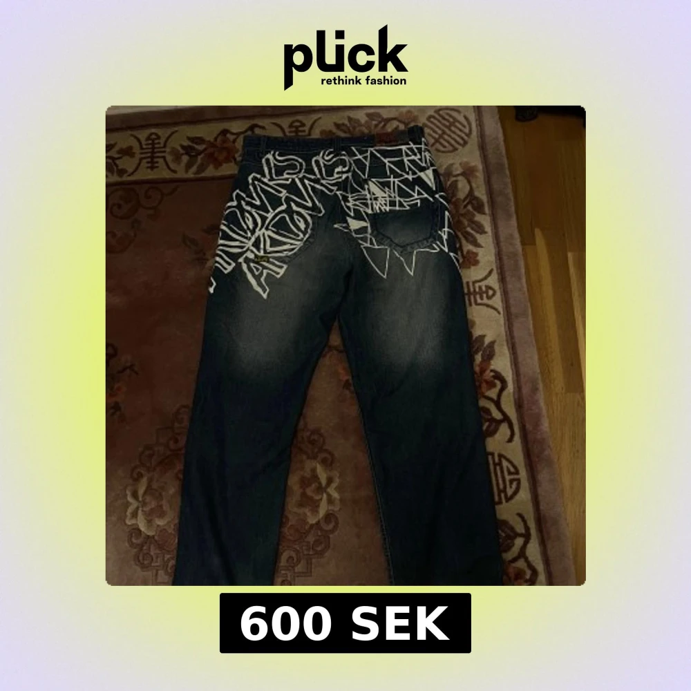 Unika mörkblå jeans från D-Noise med vit graffiti-inspirerad print över bakfickor och bakstycke. Baggy fit. DM om du är intresserad