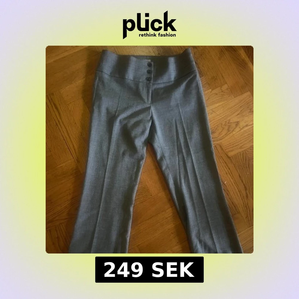 Snygga grå kostymbyxor med hög midja och knappar framtill. Perfekta för en stilren look.