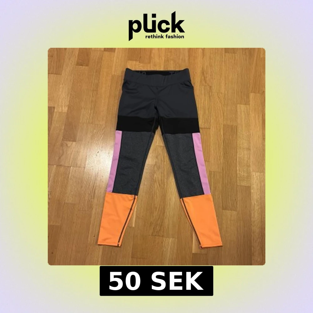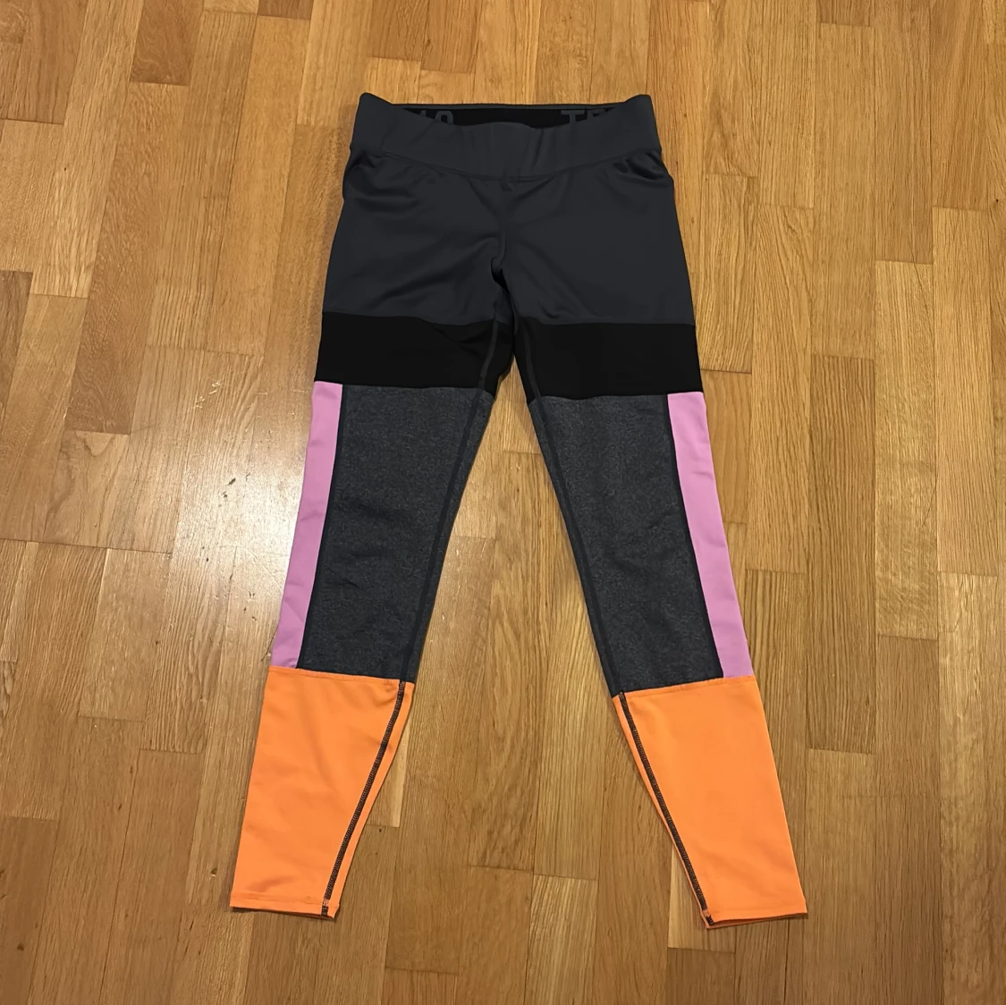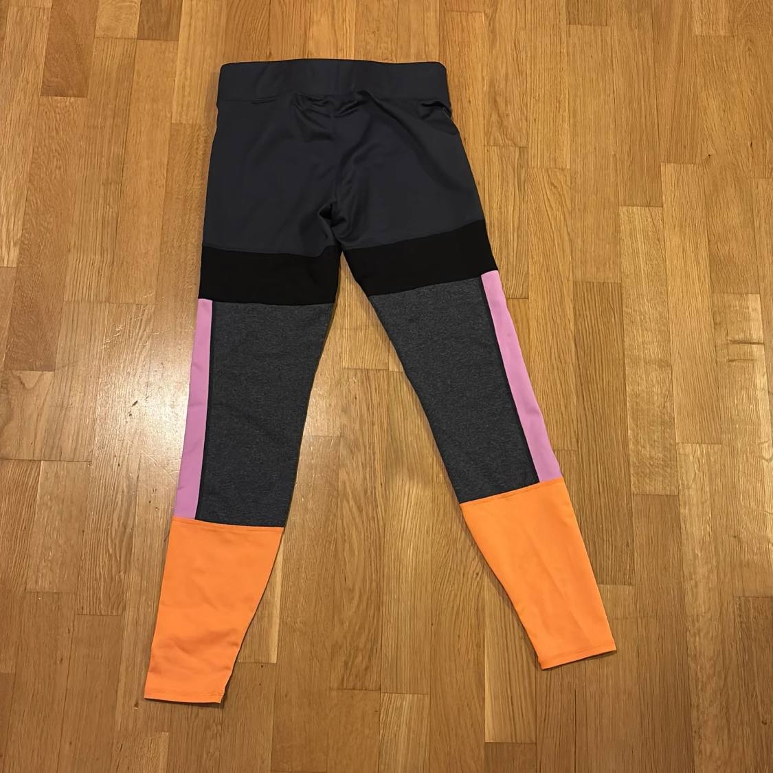 Snygga och bekväma leggings från H&M Sport i en mix av färger: grå, svart, lila och orange. Perfekta för träning med en tight passform och elastiskt material för maximal rörelsefrihet.