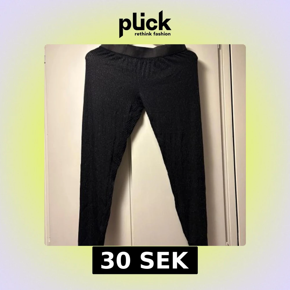 Säljer ett par svarta leggings från Pieces med glittriga ränder. De har en elastisk midja och sitter tight. Perfekta när du vill sticka ut lite extra med din outfit!