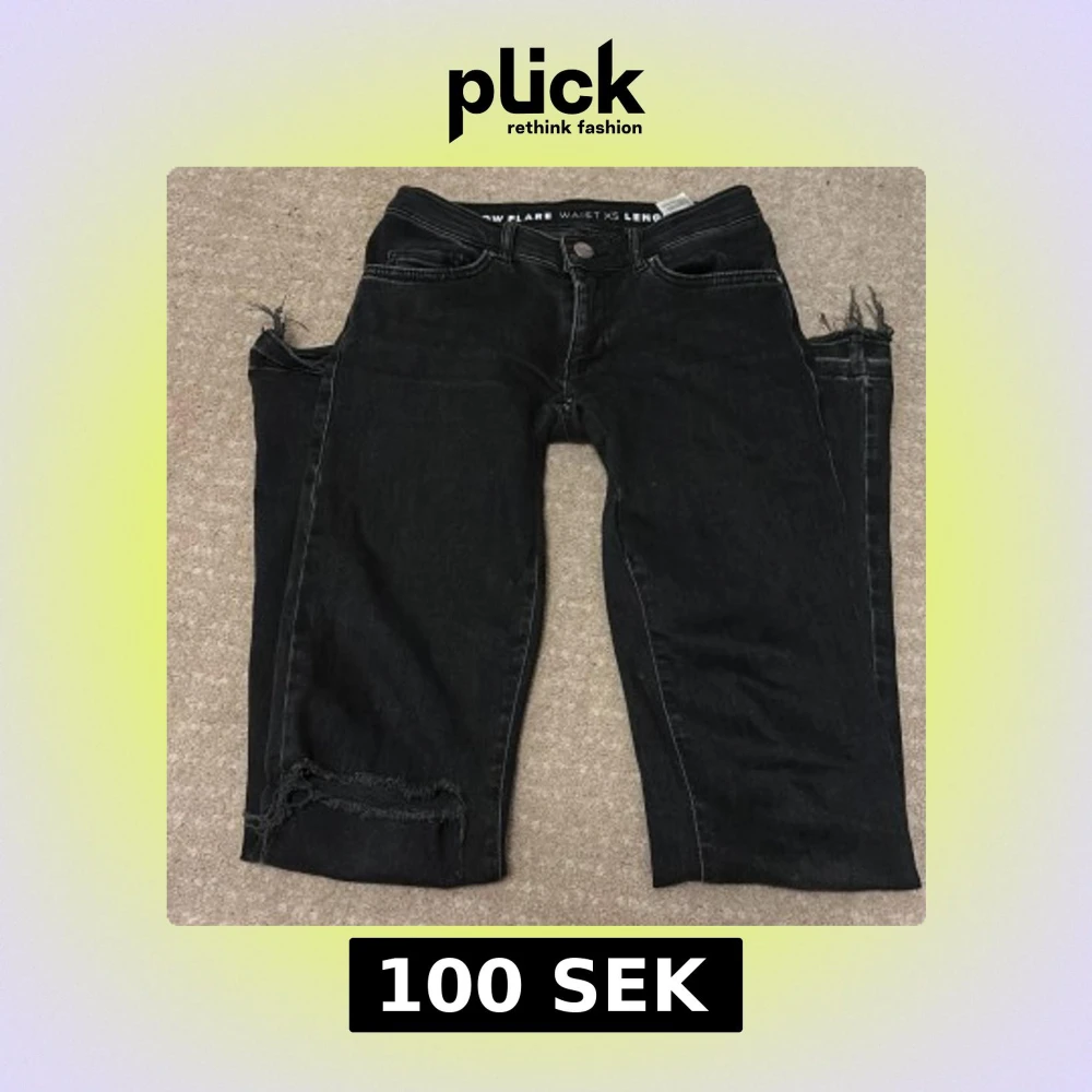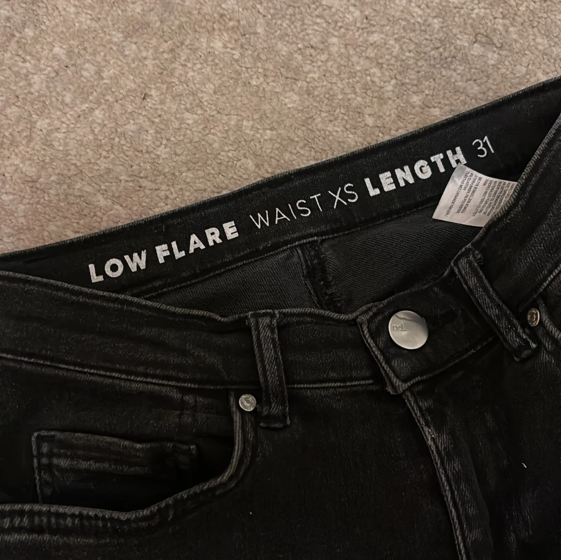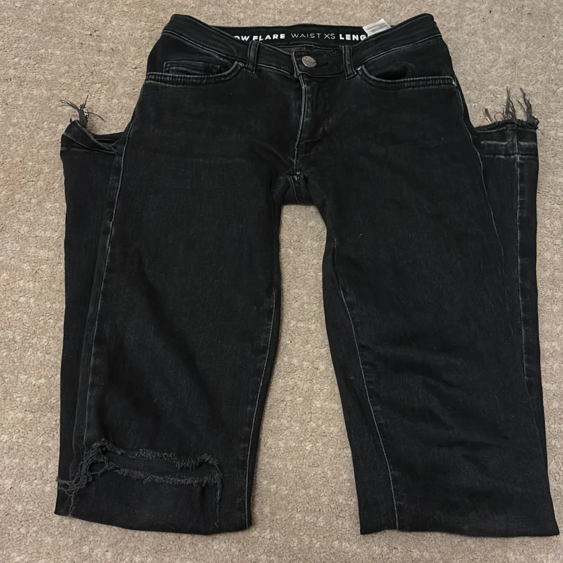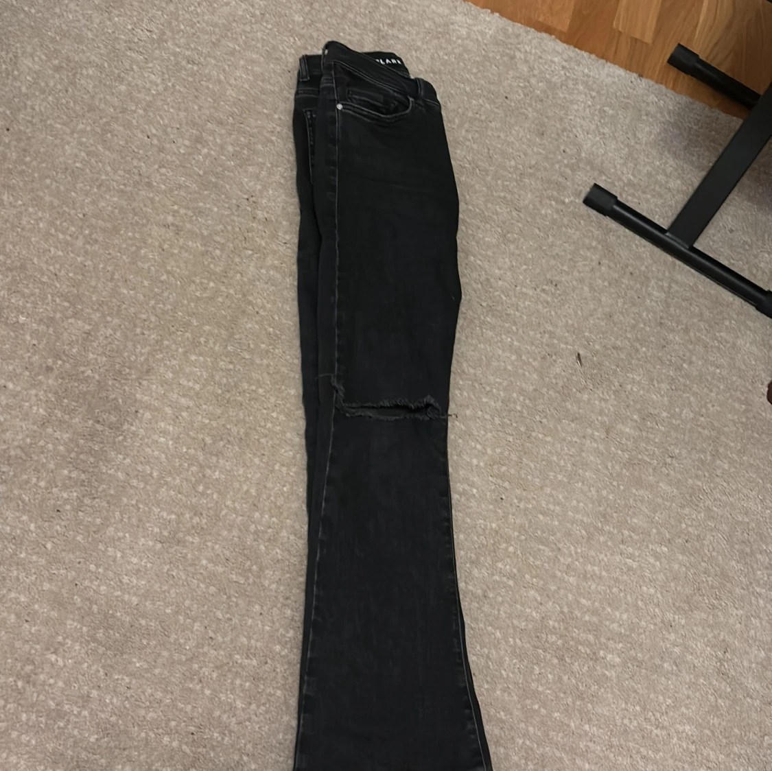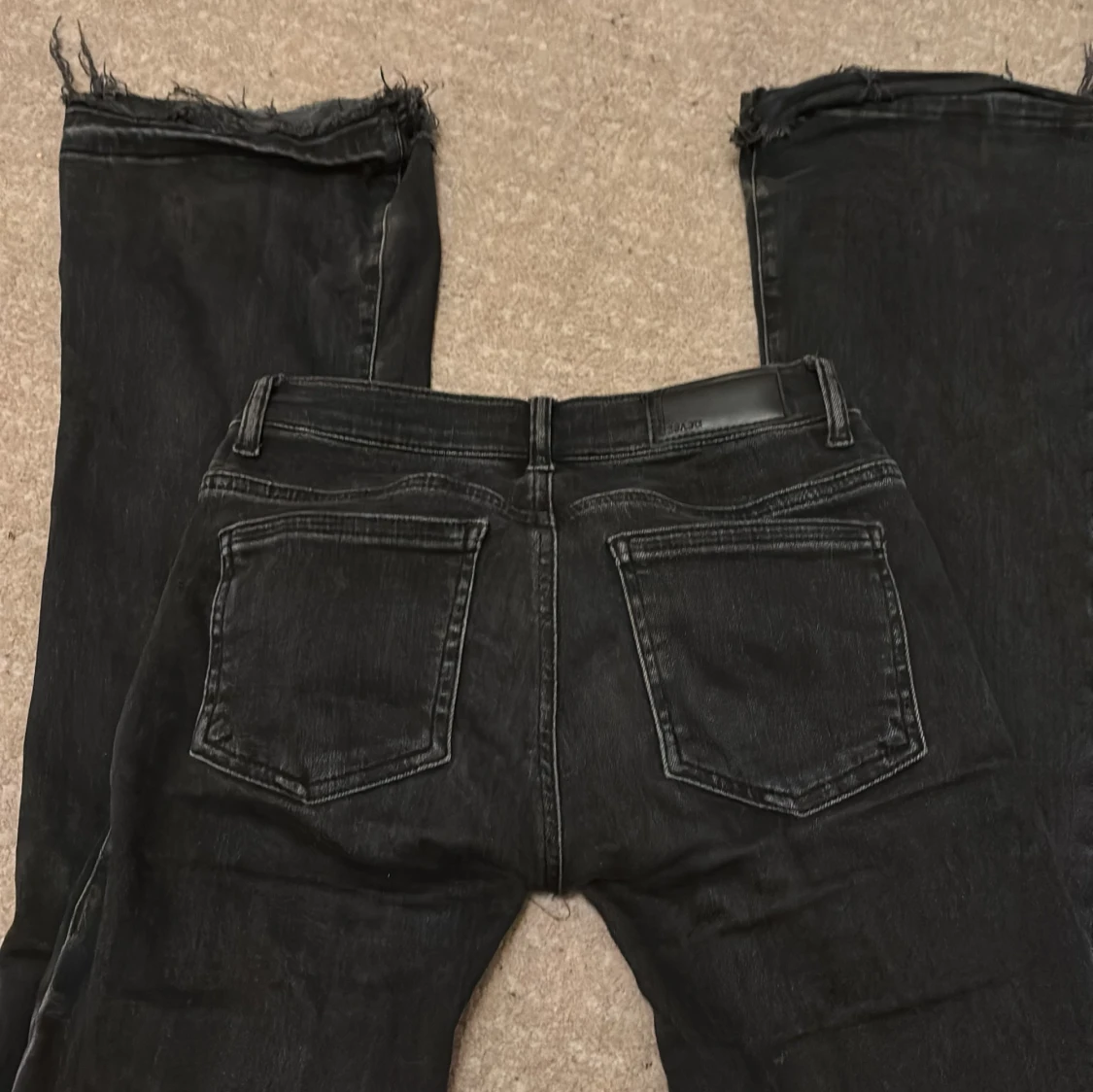 Snygga svarta jeans med låg midja och flare-stil. De har en cool slitning vid knäet och fransiga kanter vid bensluten. Perfekta för en trendig look!