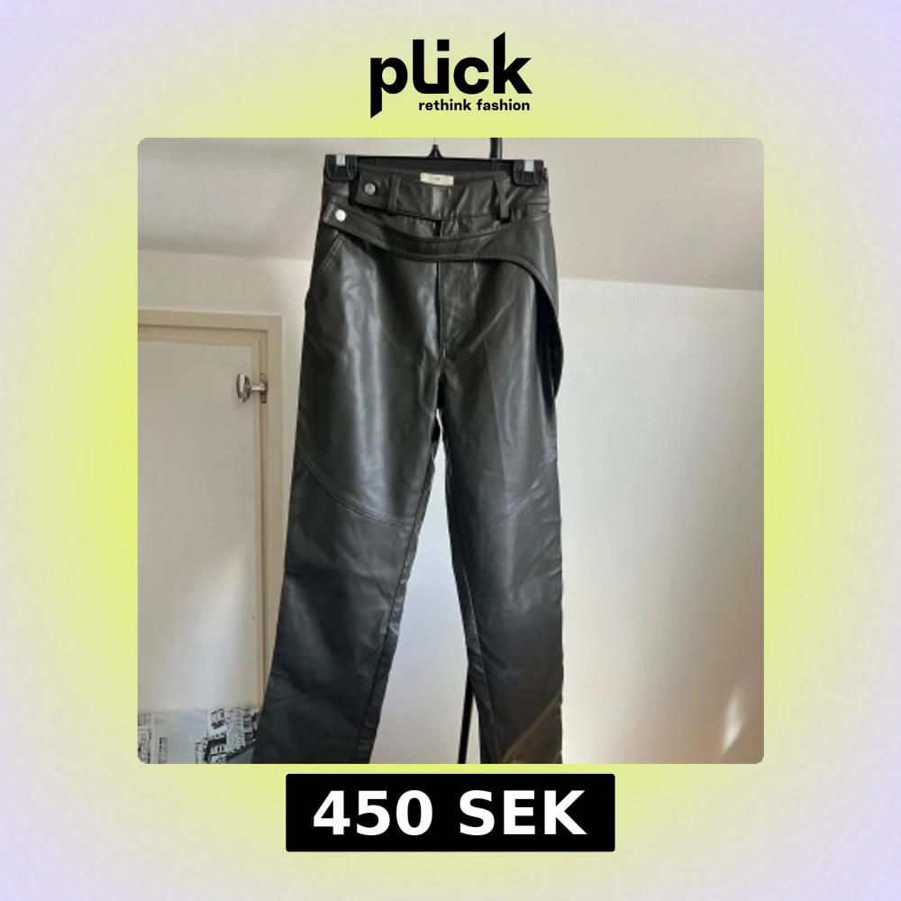 Snygga svarta skinnbyxor med hög midja och stilrena knappar. Byxorna har en unik design med detaljerade sömmar och en modern passform. Perfekta för att ge din outfit en edgy touch.