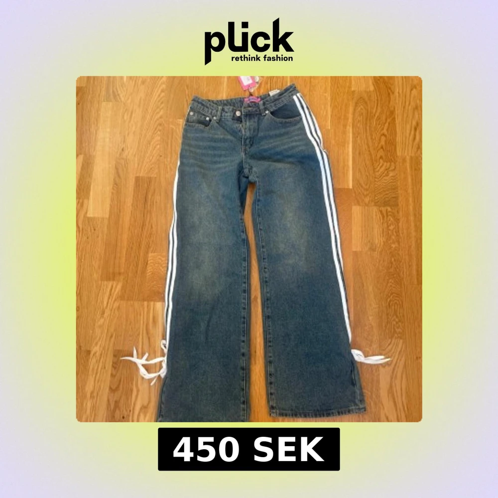 Säljer ett par coola lågmidjade blå jeans från Edikted i storlek XS. De har vita ränder längs sidorna och snygga knytband vid anklarna. Helt oanvända och köpta för 1600