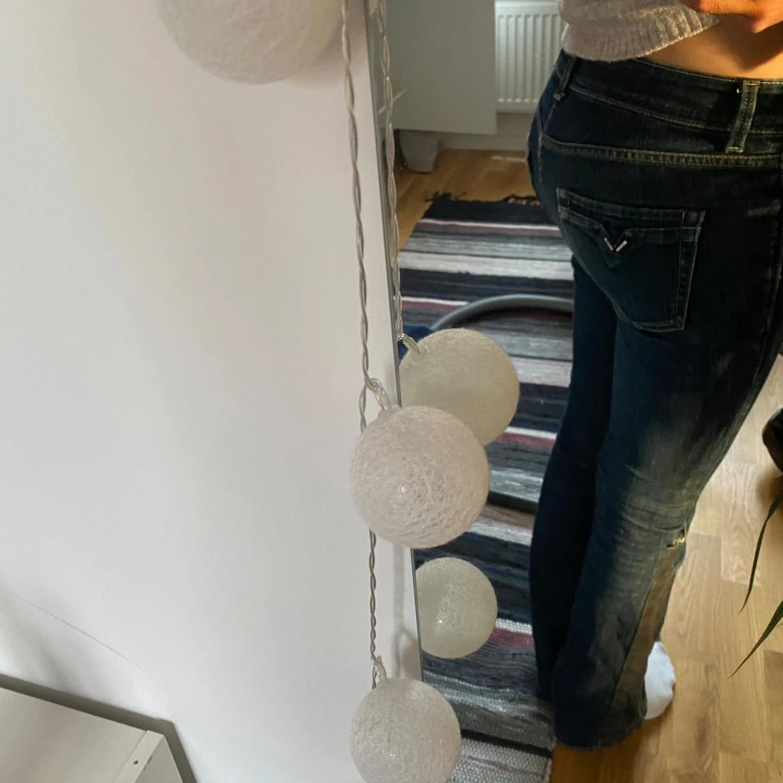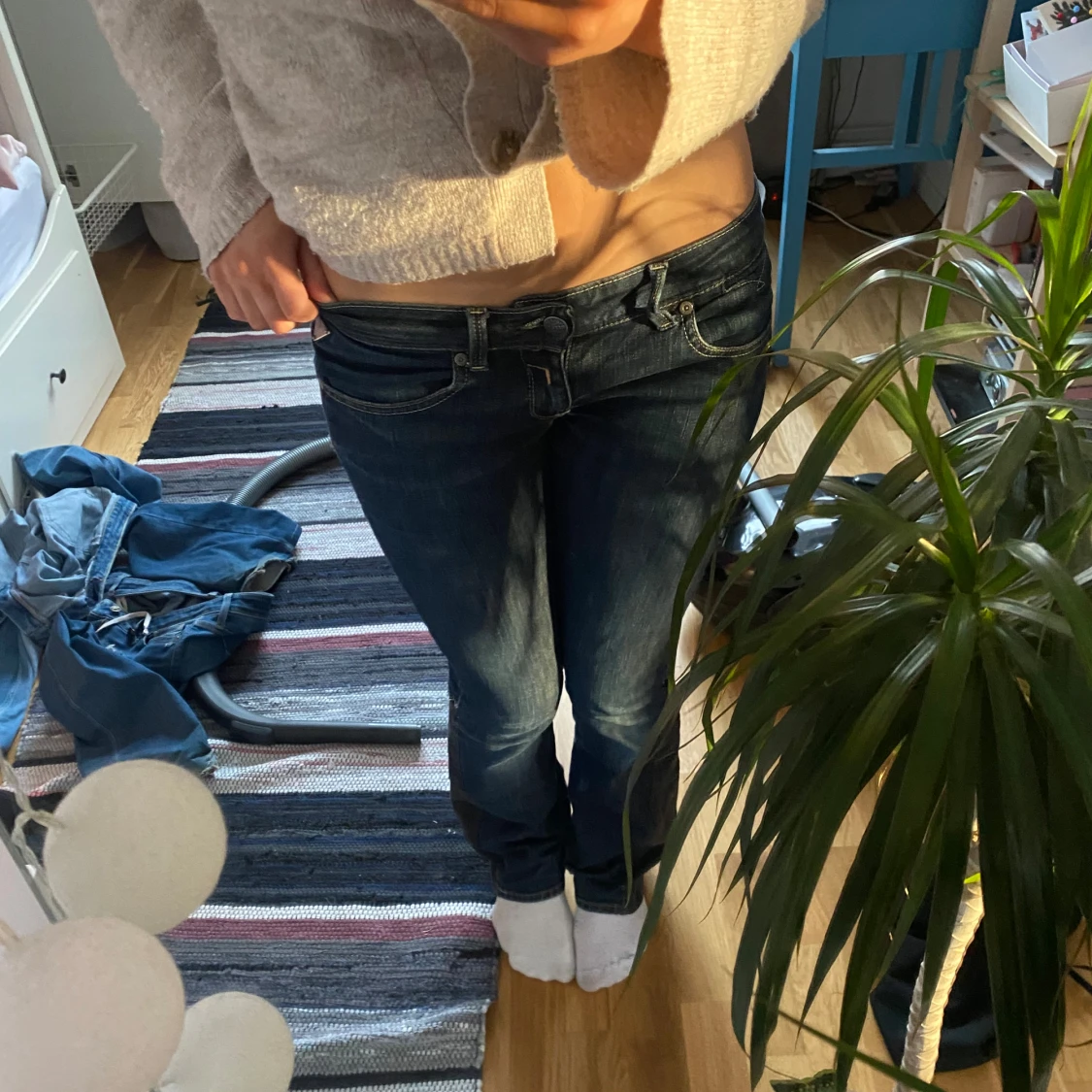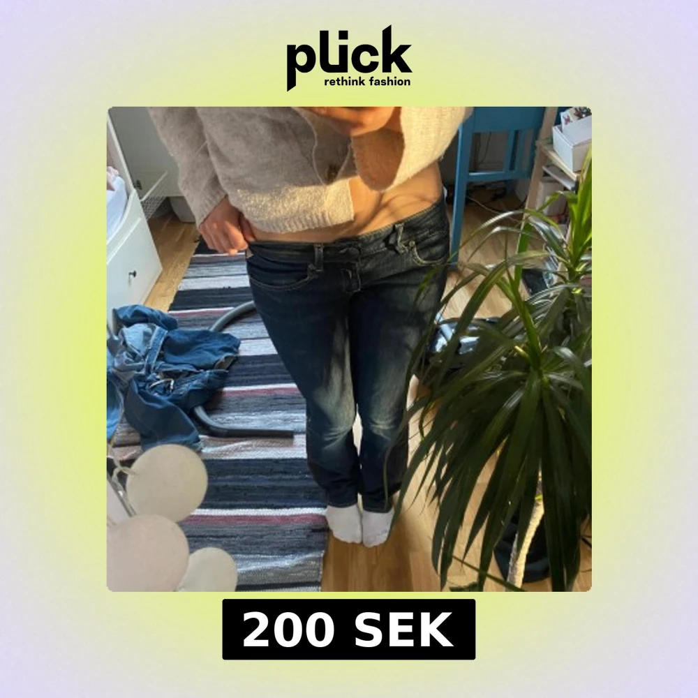 Snygga mörkblå omsydda jeans med låg midja och en tight passform. Perfekta för en avslappnad stil. Klassisk design med fem fickor och knappgylf.