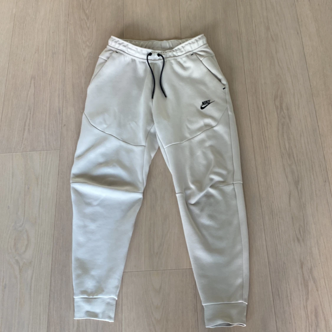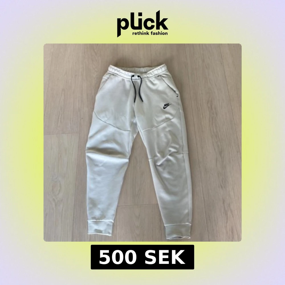 Säljer ett par Nike tech fleece byxor med elastisk midja och snörning. Byxorna har sidofickor och en liten Nike-logga på ena benet. Perfekta för en avslappnad stil.