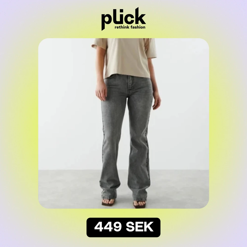 Jeans med medelhög midja, från Gina tricot. Jeansen är gråa och har en slim fit i denim med stretch. De har utsvängda ben med fullängd och dragkedjegylf. Passar för dig som är 167+