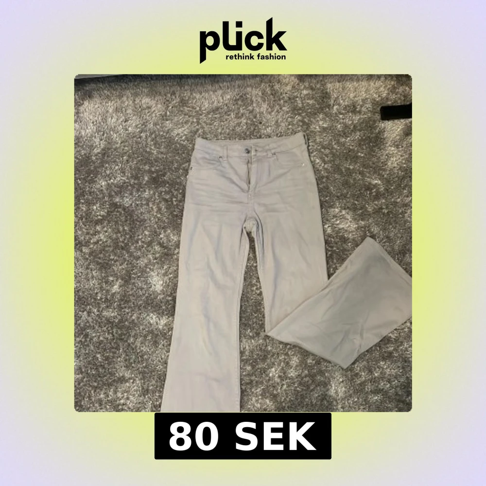 Säljer ett par ljusgråa jeans med bootcut passform. Byxorna har klassisk femficksdesign, hällor för bälte och stängs med dragkedja och knapp. Perfekta för en stilren och avslappnad look.