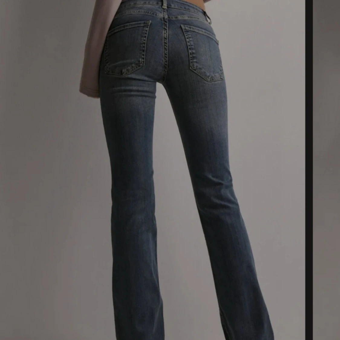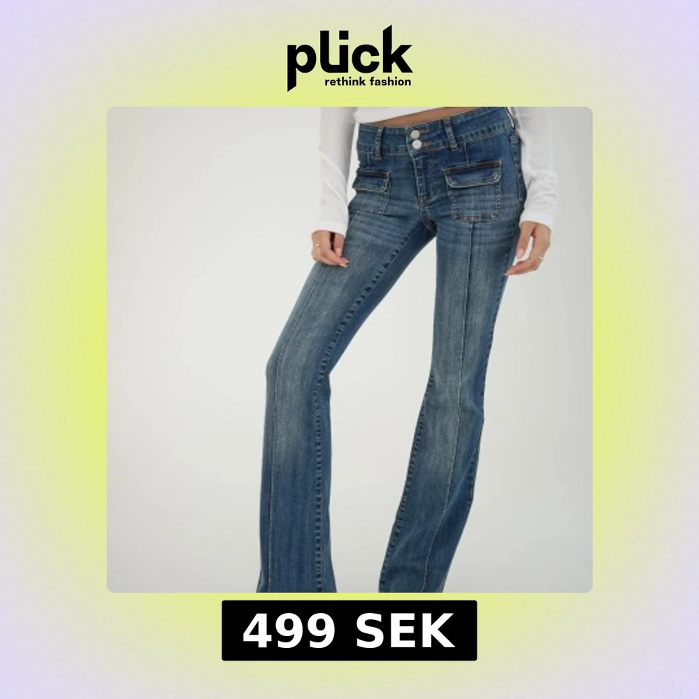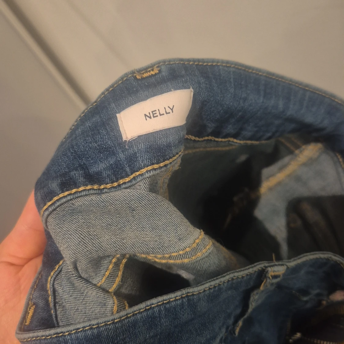 Snygga blå jeans från Nelly med raka ben och dubbla silverfärgade knappar i midjan.🌸 Low wasit och bootcut🌸. Klassisk femficksmodell med extra fickdetaljer framtill. Dem är slutsålda överallt och är endast lite slitna längst ner på byxorna men märks knappt💐💐💐original pris 699 kr