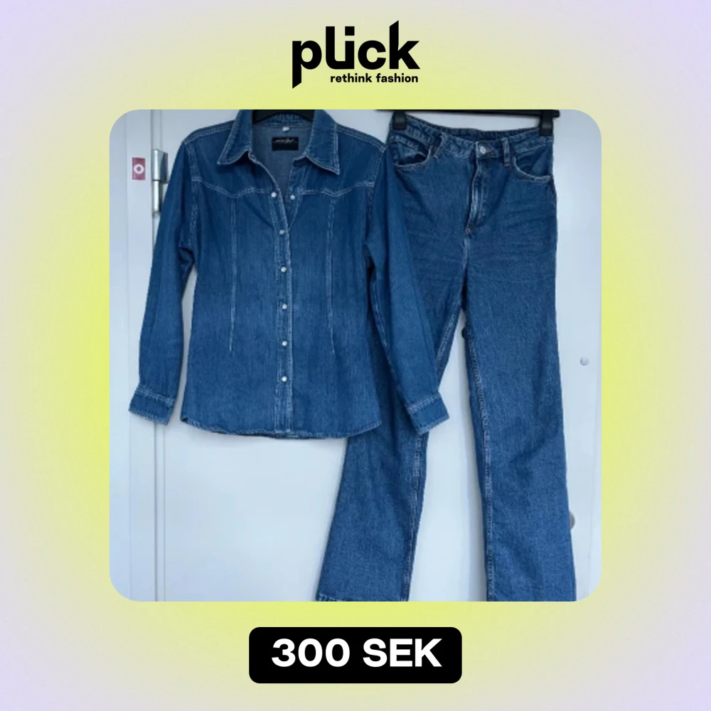 Supersnyggt vintage denimset i mellanblå färg. Skjortan är angiven som stolek 42 men är insydd så skulle säga att den mer motsvarar en 36a. Går lätt att sprätta upp om man vill ha mer oversize. Byxorna har ej lapp men uppskattningsvis storlek 36