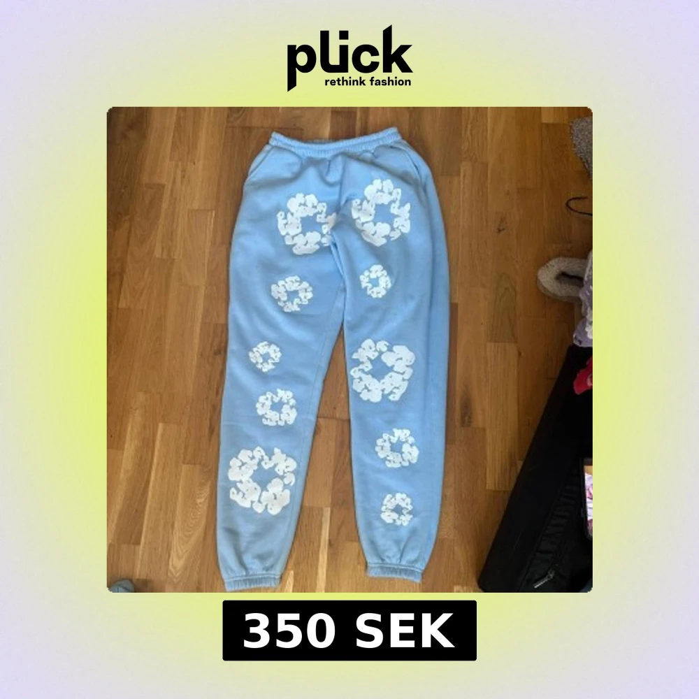 Säljer denim tears ljusblå mjukisbyxor med elastisk midja och muddar vid bensluten. Byxorna har unika vita molnliknande mönster tryckta över hela framsidan och baksidan, vilket ger dem en chill och kreativ vibe. Perfekta för att hänga hemma eller dra ut på stan.